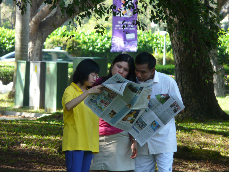 四名在新加坡工作的中国青年原先在远处观望,后来走近炼功场坐在草坪上静静地看着。当他们看到一名法轮功学员在炼功场外时便主动交谈,要求讲一讲法轮功的事情。他们从学员手中接过传单后,问了许多关于中共为什么打压法轮功及如何修炼法轮功的话题。其中一位青年人说,这样的炼功场面给他很大的震撼,他刚从国内来到新加坡工作,听说过法轮功但在国内很难接触到,上网也很难。学员提醒他,来到新加坡能看到法轮功这就是缘份,鼓励他不可错过本地举办的九天学习班。