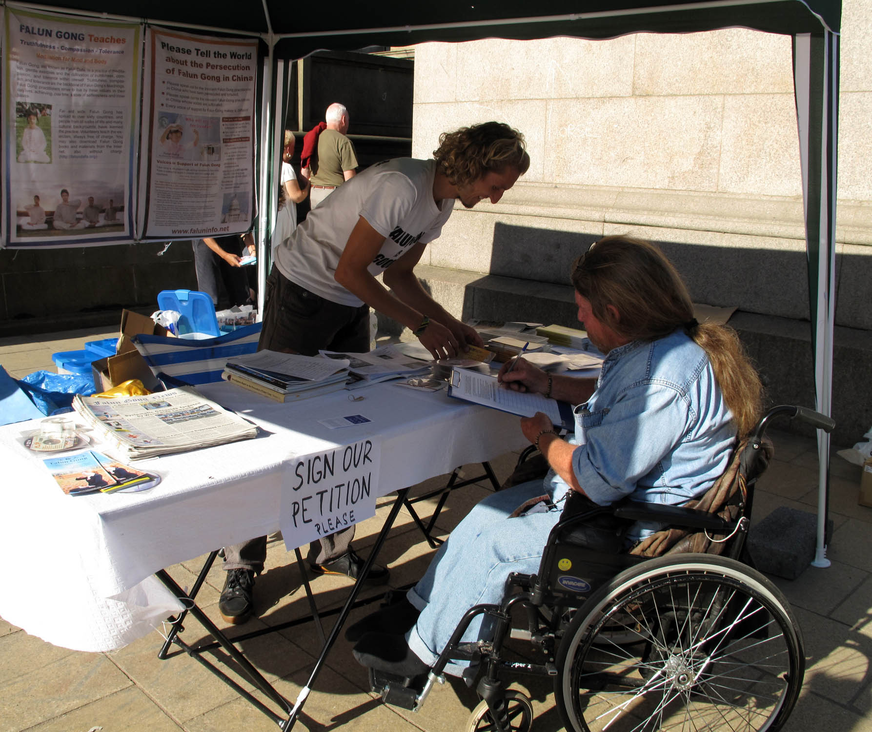 法轮功学员的一次次到来让越来越多淳朴善良的苏格兰人了解到法轮功真相。家住爱丁堡的麦克•默考马克先生(Mike McOrmorck)是位坐在轮椅上的残疾人,他先是停在一边定睛观看法轮功学员,然后把轮椅车驶到布置在地上的真相展板近前仔细阅读。看到这些真相后他立即要求在反迫害征签表上签名。他对记者说:“我不知道为什么他们要被迫害,我对此非常难过,所以我签了请愿书。”“人们生活在一个星球上,为什么要互相残酷对待呢?比如说我并不了解你,但是我对你没有任何敌意。”第一次看到法轮功功法演示的麦克告诉记者说:“这功法太好了,带给人很多的宁静。我很喜欢。”