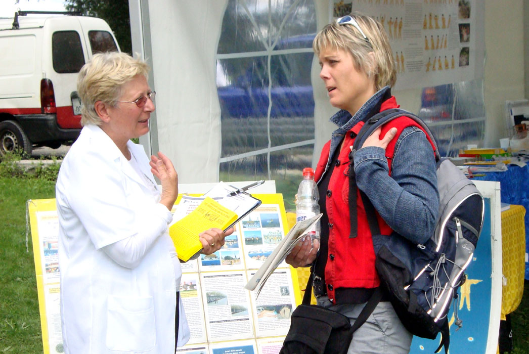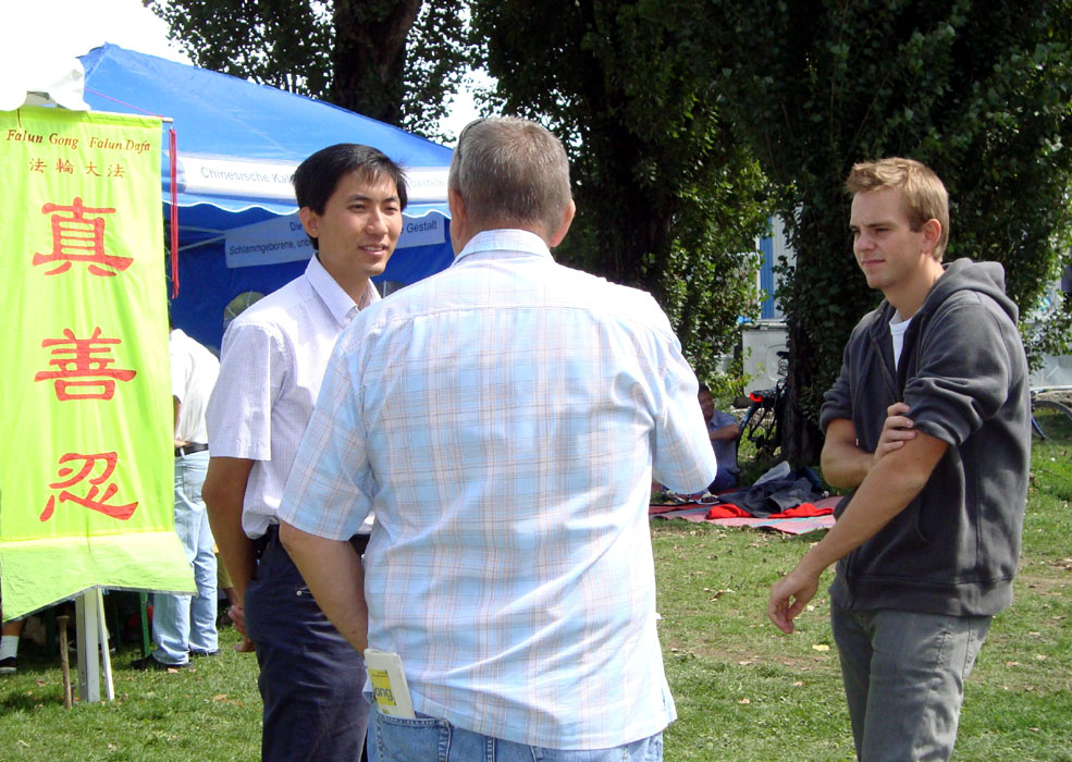 一位脚步匆匆的瑞士女子,注视了好一会儿现场的功法表演。她说自己马上要出门旅游,两个月回来后会去炼功点学炼法轮功。学员建议她,出门旅游,时间充裕,何不买一本《转法轮》带在身边先阅读?这位女士欣然接受了建议。