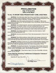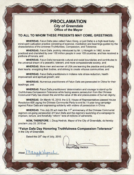 鉴此,我,印第安纳州格林德尔市市长道格•赫瑞克(Doug Hedrick),特此宣告二零一零年七月二十日为印第安纳州格林德尔市“颂扬真、善、忍的法轮大法日”。