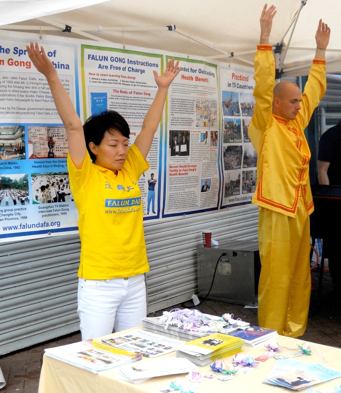 几位华人女士经过法轮功展位时微笑地表示,她们以前看过法轮功学员的功法演示,希望拿一些学员叠的纸莲花回去送给她们的学生。一位西人女教师在经过时也被装点展位的纸莲花吸引,希望拿回去送给学生。在得知这些莲花所象征的纯洁和希望的涵义,以及法轮功学员赠送手折莲花是希望更多民众了解发生在中国的对法轮功学员的残酷迫害后,她表示可以考虑在学校举办讲座,让学生了解所发生的这一切。