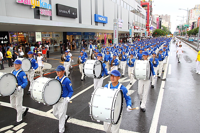 记者会后,在天国乐团演奏“法轮大法好”等多首乐曲的前导下开始大游行。震撼人心的动人乐曲,吸引络绎不绝的路人驻足聆听,流连忘返。大游行中有数百位法轮功学员于行进中演示五套功法,展现大法的美好。人们纷纷拍照留念,表达了他们对法轮功的喜爱和欢迎。