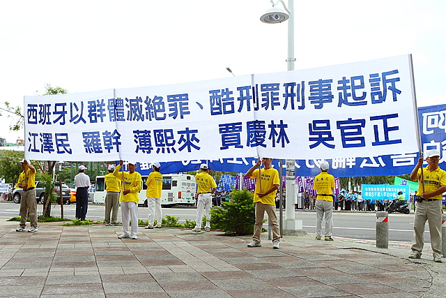 大游行中的第二个方阵有揭露中共残酷迫害法轮功的真人酷刑模拟演示、一幅幅被中共迫害致死的法轮功修炼者遗像,以及传达西班牙国家法庭起诉江泽民的横幅旗牌。