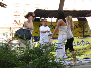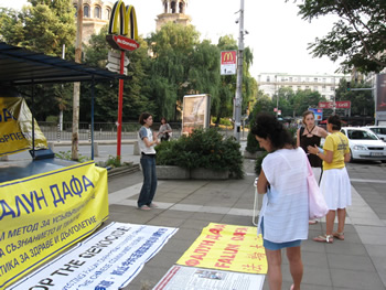 日前,为纪念反迫害十一周年,保加利亚的法轮功学员于二零一零年七月二十日在首都索菲亚(Sofia)和另外两个大城市Plovdiv和Varna向世人讲法轮功的真相,曝光中共迫害的邪恶。期间遇到一位男士,说他在爱尔兰时就碰到过法轮功学员,他已经知道了真相。而两位接了传单的希腊人也记起他们以前曾经在这里遇到过法轮功学员举办类似的活动。几位当地女士发现这是和法轮功有关的活动后立即签名,她们此前已经听说了中共摘取法轮功学员器官的兽行。