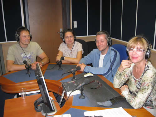 ![]() 二零一零年七月二十六日,保加利亚法轮功学员们和主持人(右)在电台的直播间内。 |