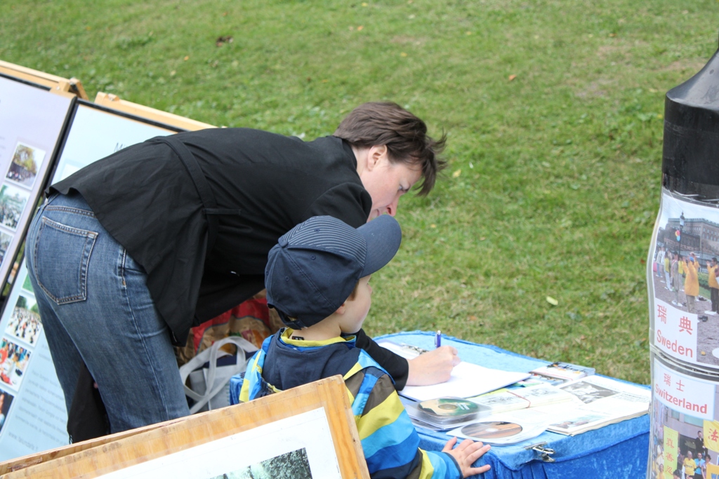 ![]() 一位母亲带着孩子来签名声援法轮功 |