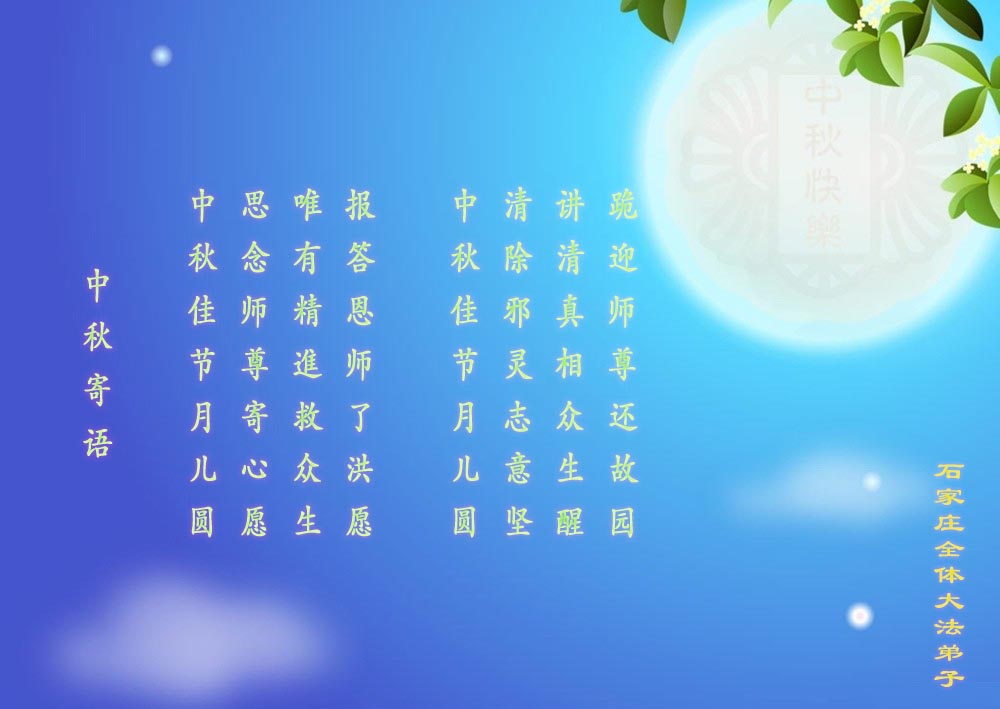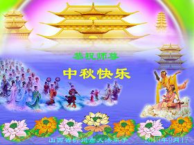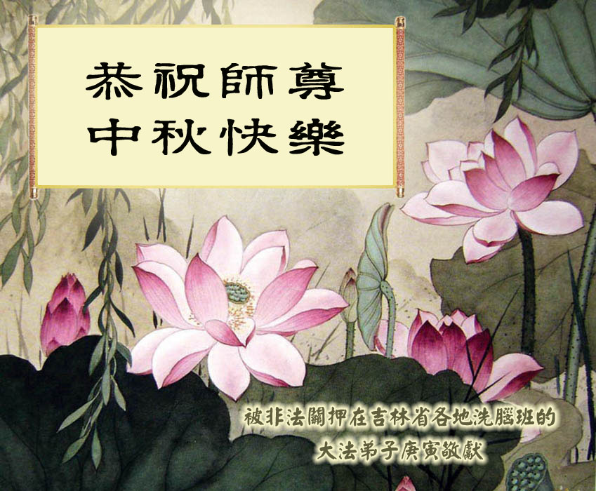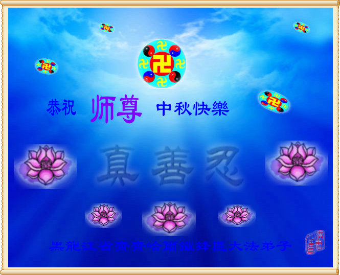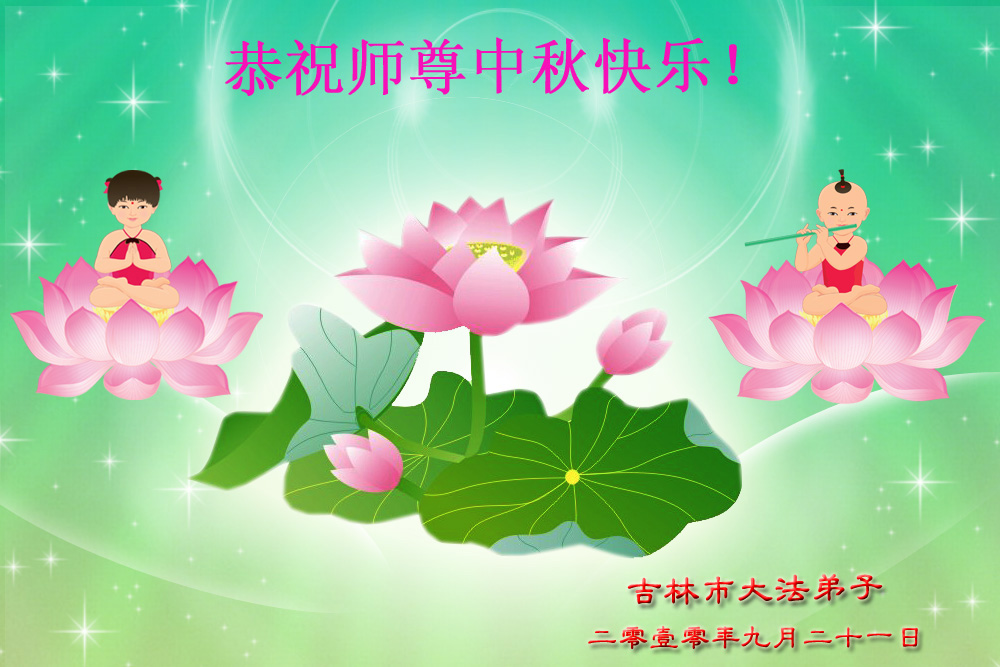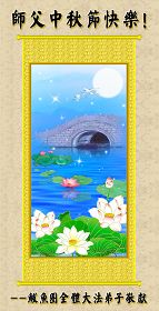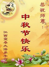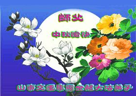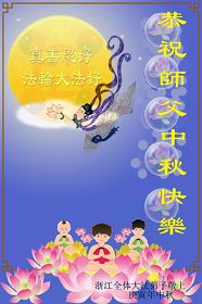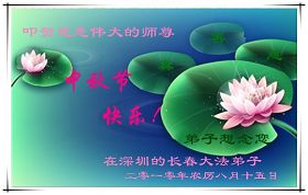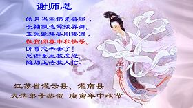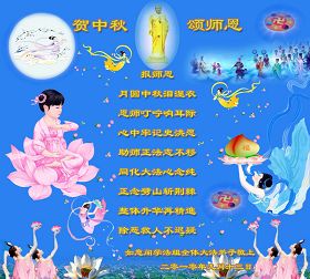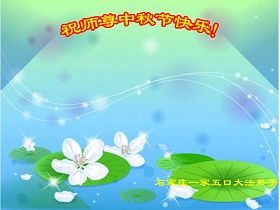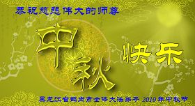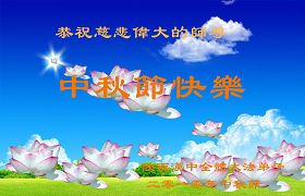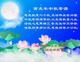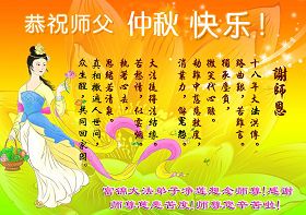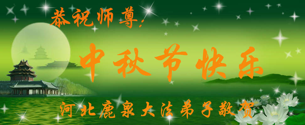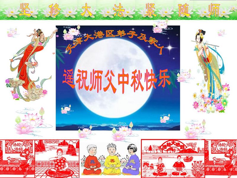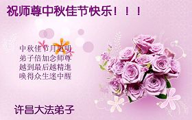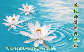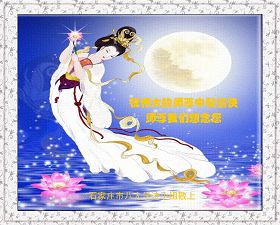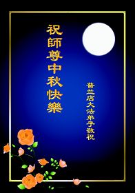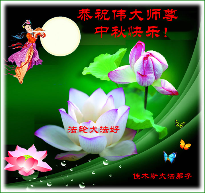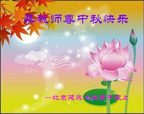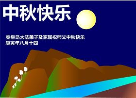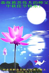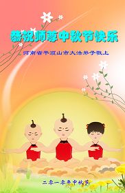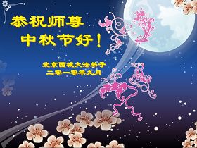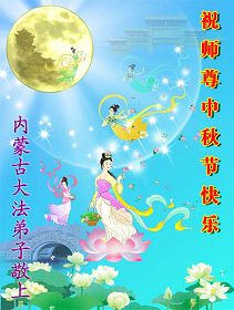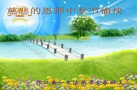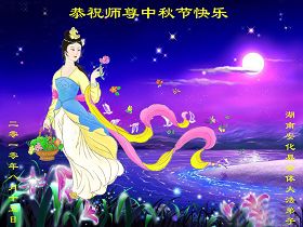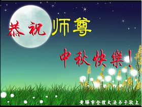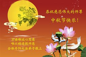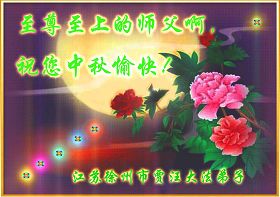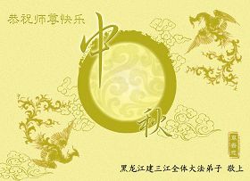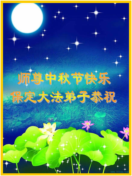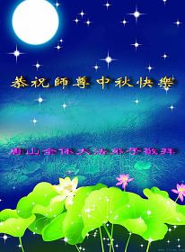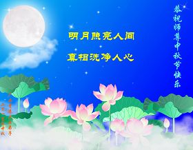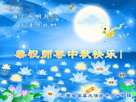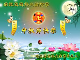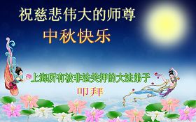 一年一度的中秋节又到了,大法弟子遭受残酷的迫害走过了十一年,很多同修有家不能团圆,或身处牢狱,或四海为家居无定所,还坚持讲真相救世人。我们伟大的师尊为了我们承受之多,是我们无法想象的。值此中秋节到来之际,衷心祝愿师尊能少操点心,没做好的弟子做的更好,更多被蒙蔽的世人能明白过来,从而得到救度。世间清气荡涤邪恶,大法弟子不应受到迫害的。