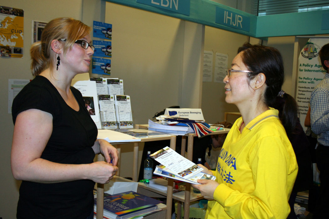 海牙作为国际城市,很多国际非政府组织在这里设立了办公室。不少非政府组织也参加了这次文化博览会。学员们和一些非政府组织的成员做了深入交谈,他们都对大陆法轮功学员遭受的迫害表示同情,并对学员们反迫害的举动表示理解和支持。有些非政府组织成员收到莲花后,把美丽的莲花挂在他们自己的展台上。