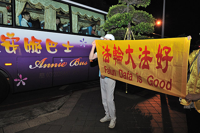 ![]() 法轮功学员在台北国际会议中心外举横幅正告杨松停止迫害 |