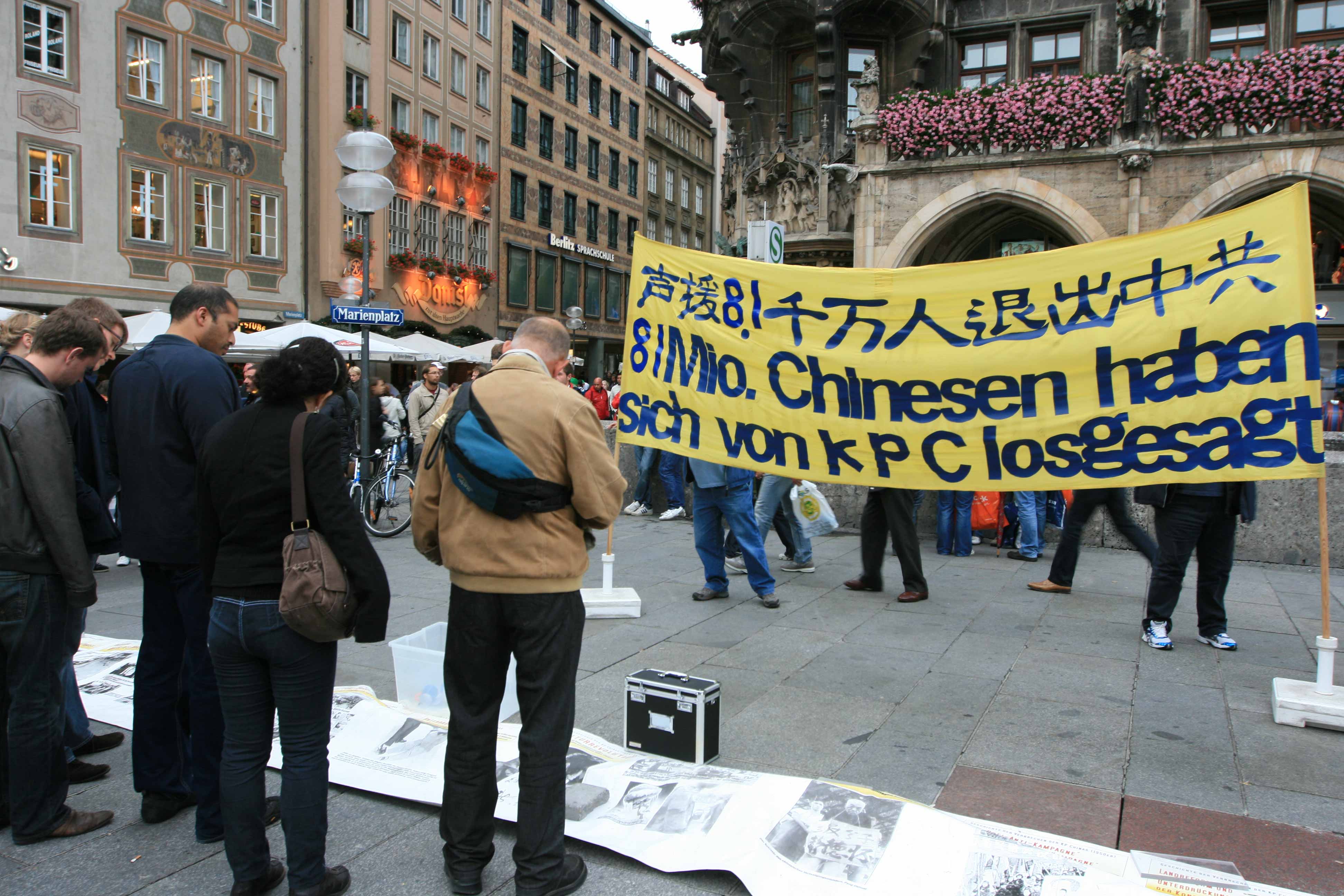 ![]() 德国慕尼黑玛琳广场上,法轮功学员举办讲真相活动 |