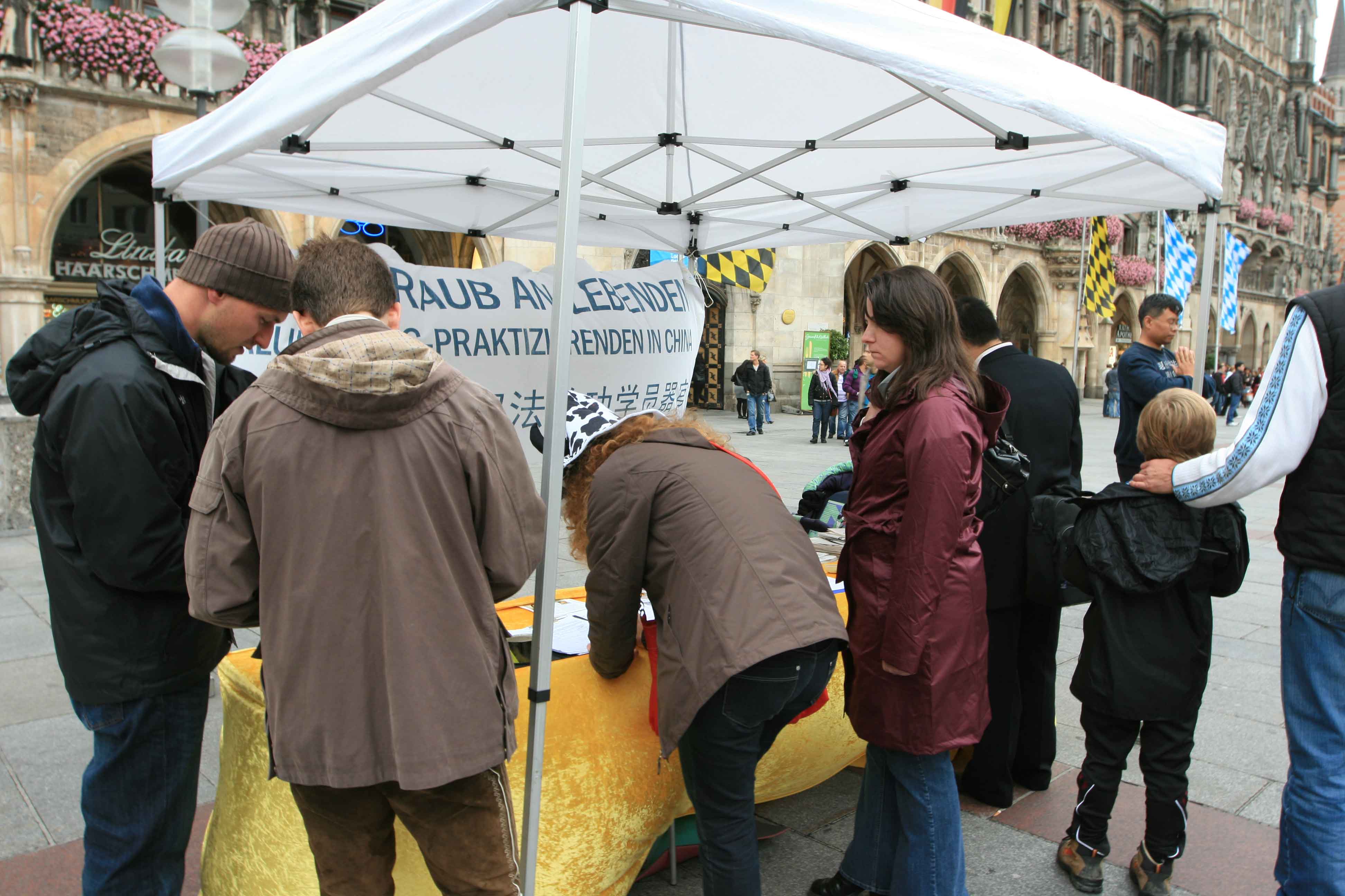 一位慕尼黑的公务员,曾在路上遇到过一位老年法轮功学员发资料给中国大陆的游客,她很好奇,很想知道资料的内容是什么,但是中文资料她看不懂,那位老年学员德文又不好,说不清楚。可巧今天她路过玛琳广场看到了法轮功学员举办的活动,并认出了那位老年女学员。她迫不及待地要德文资料,观看展示出的图片,并在签名簿上签名。她说她相信情况就要好转了,用不了多久,就会出现一种来自天上的力量,使得人心都变好,不好的、邪恶的东西都会被改变。