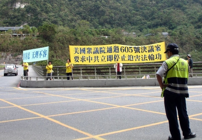 杨松一行人二十五日晚间十时抵达花莲美仑饭店,所到之处都有大批法轮功学员拉起反迫害横幅、高喊“停止迫害”。二十六日清早七时半,杨松一行人两辆车提前出发往太鲁阁国家公园,以躲避法轮功学员的抗议,还特别让警车开道前往,阻隔其他车辆靠近,但杨松沿路上仍遭遇法轮功反迫害的声浪。