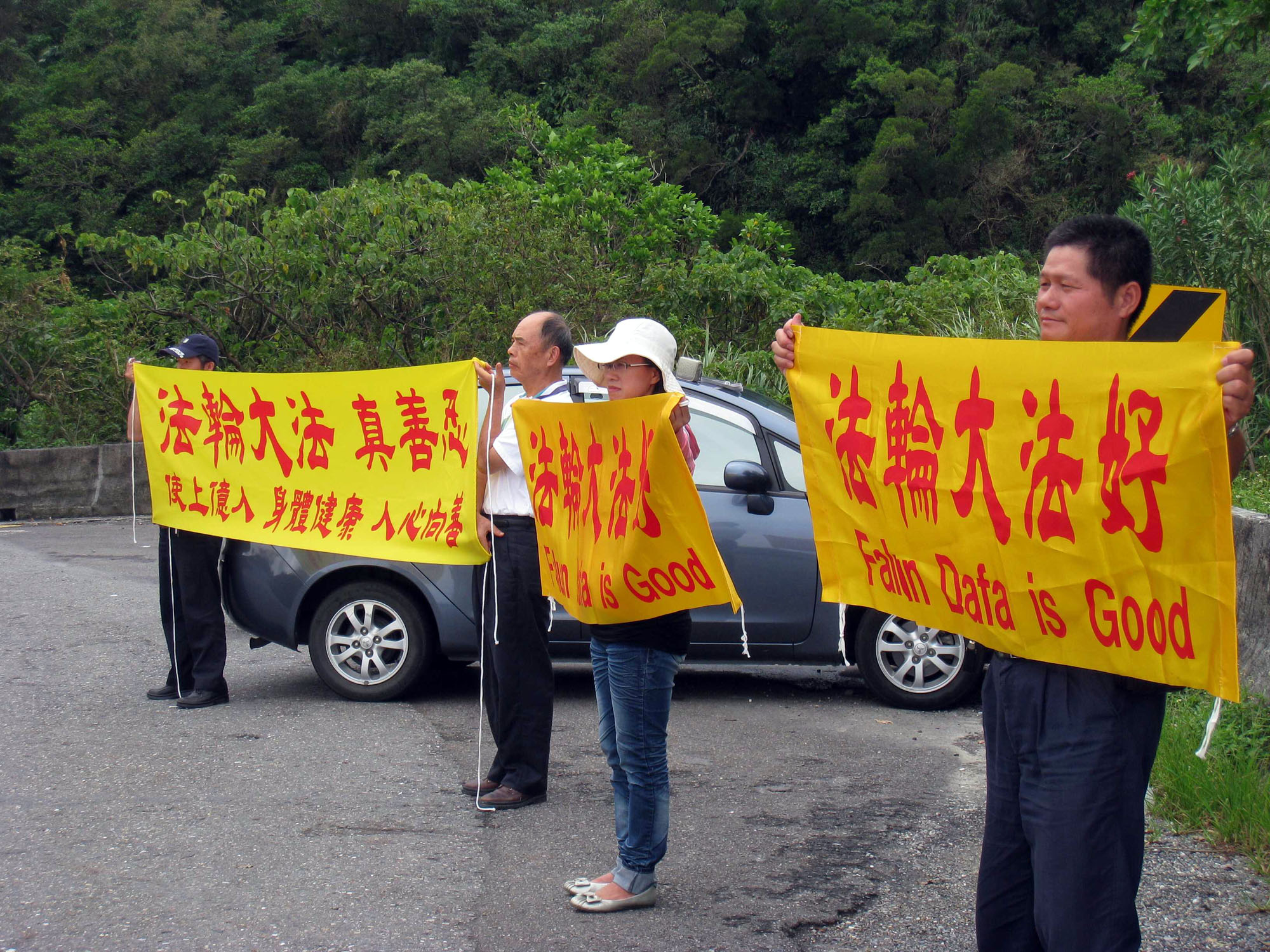 ![]() 在前往太鲁阁国家公园的公路旁,法轮功学员高举反迫害横幅 |