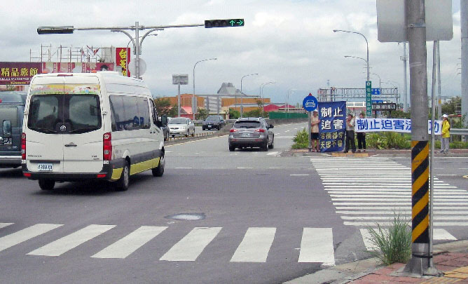 上午十一时十分,杨松的车队驶近国道五号入口,路边又遭遇法轮功学员拉横幅如影随形,杨松座车在路口等待红绿灯时,在此等候的十余位法轮功学员高声抗议:“杨松你被告了,台湾不欢迎你!停止迫害法轮功!”并有二位学员近距离靠近车队,展示“法轮大法好”横幅。