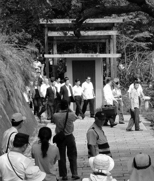 ![]() 杨松游日月潭,想避开法轮功学员抗议,不敢从水社码头搭船,改走涵碧楼后门小道搭船。 |