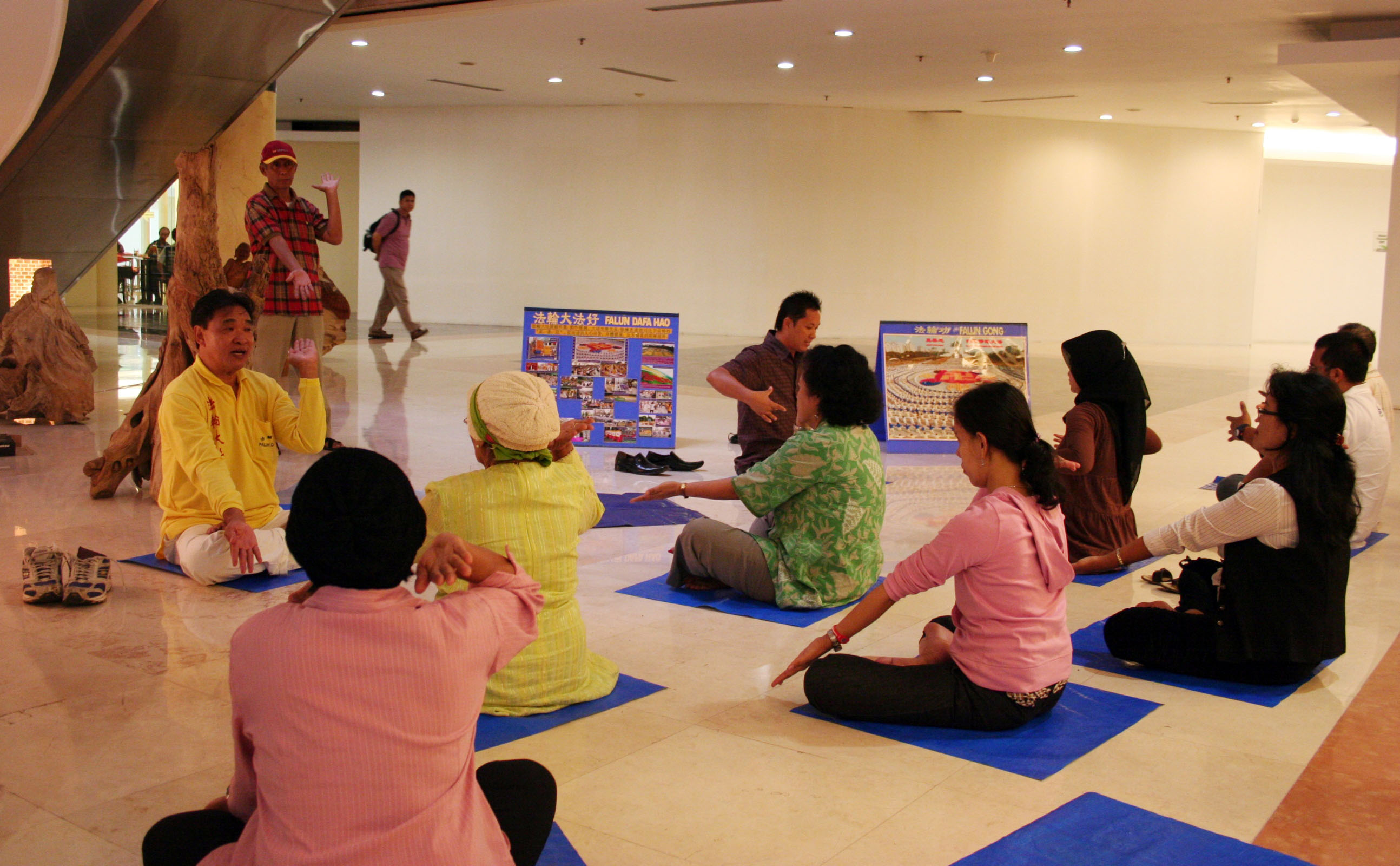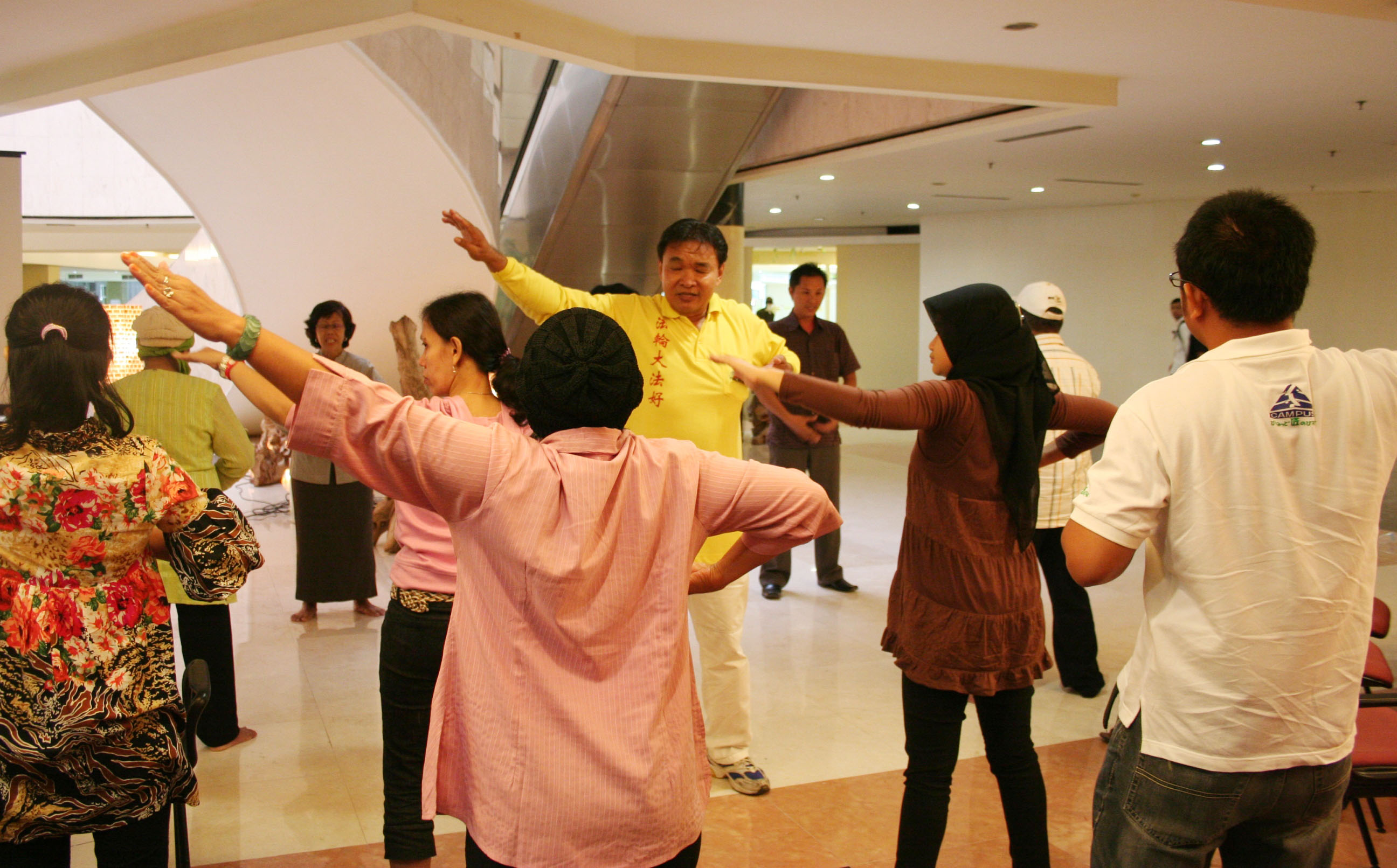 活动中播放了法轮功创始人李洪志先生的教功录像。然后几位法轮功学员当场手把手地辅导感兴趣的与会者学习炼功动作。学功者个个感觉良好,有的马上向法轮功学员恭请修炼法轮功每天必读的《转法轮》带回家学习。