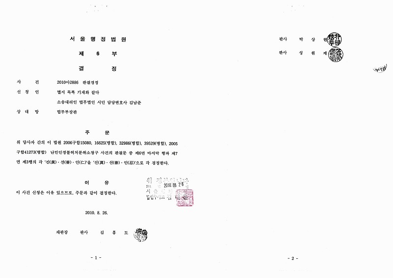 本案源起于法轮功学员曾于二零零六年向法务部提出“取消不承认难民决定”的诉讼,二零零八年一月十六日,二名法轮功难民申请者在首尔中级行政法院获得胜诉判决。当时法院在最初的判决书上确认“法轮功又称法轮大法,是以‘真善忍’为根本的既修心又修命的身心修炼法”,但是法院错误地将“忍”字在判决书记载为“仁”字。