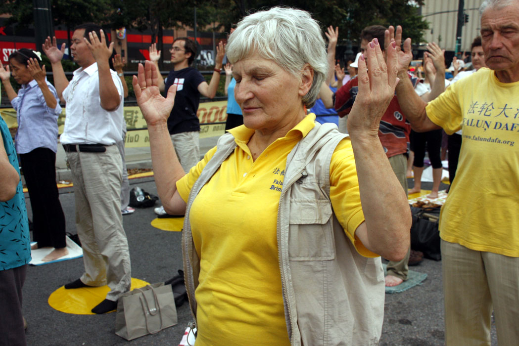 原本阴沉的天空随着法轮功学员的炼功,发正念,很快转为晴朗。尽管路边嘈杂,大家都非常沉稳,全身心地投入到炼功和发正念中。来来往往的行人为这祥和的能量场所吸引,纷纷驻足观看,拍照,接受真相传单。值勤的警察很配合学员的要求,并且拿了一张传单阅读。