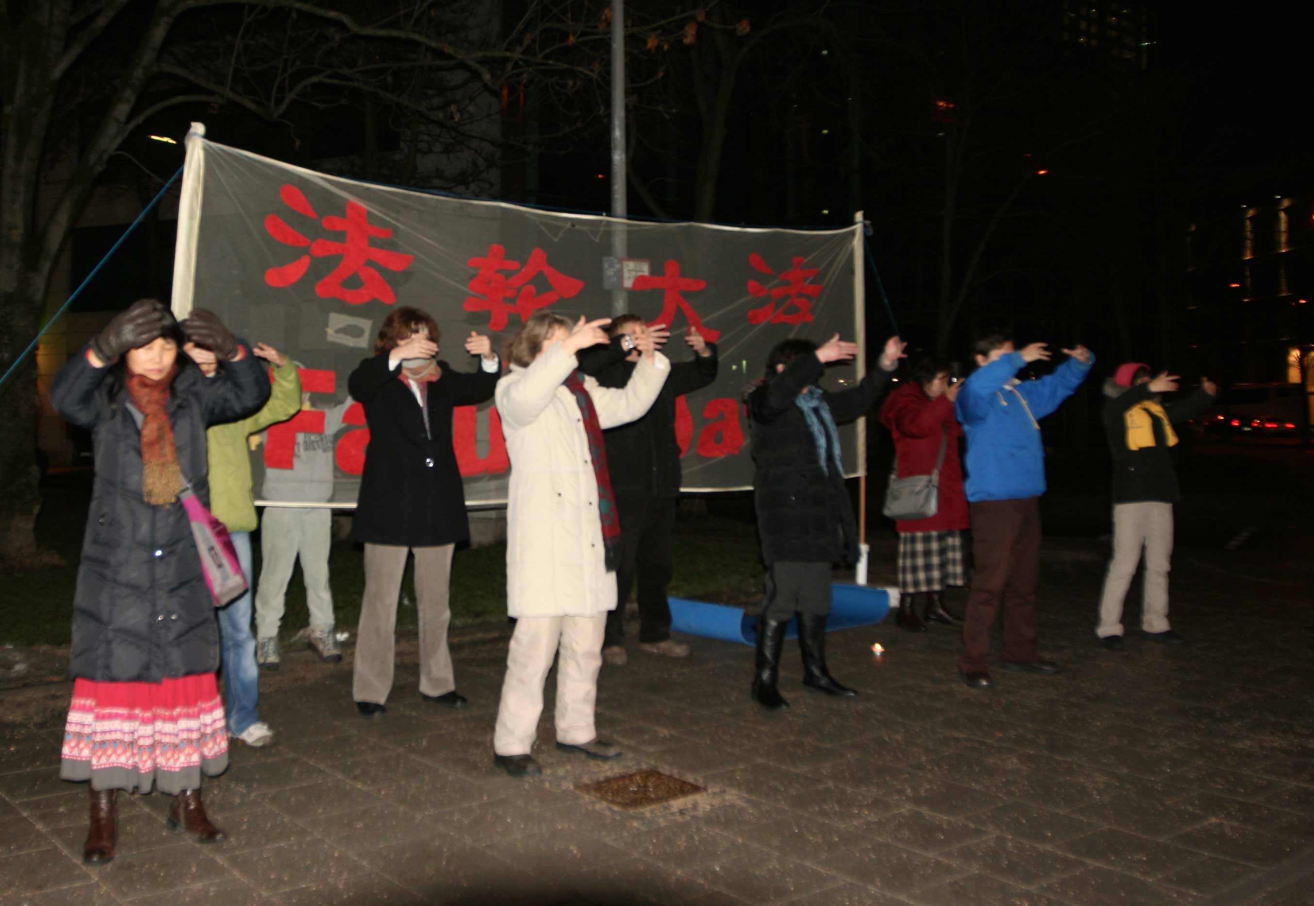 中国代表团的车队下午六点左右抵达,七点左右离开,离开时车队从法轮功学员举办活动的一侧经过。