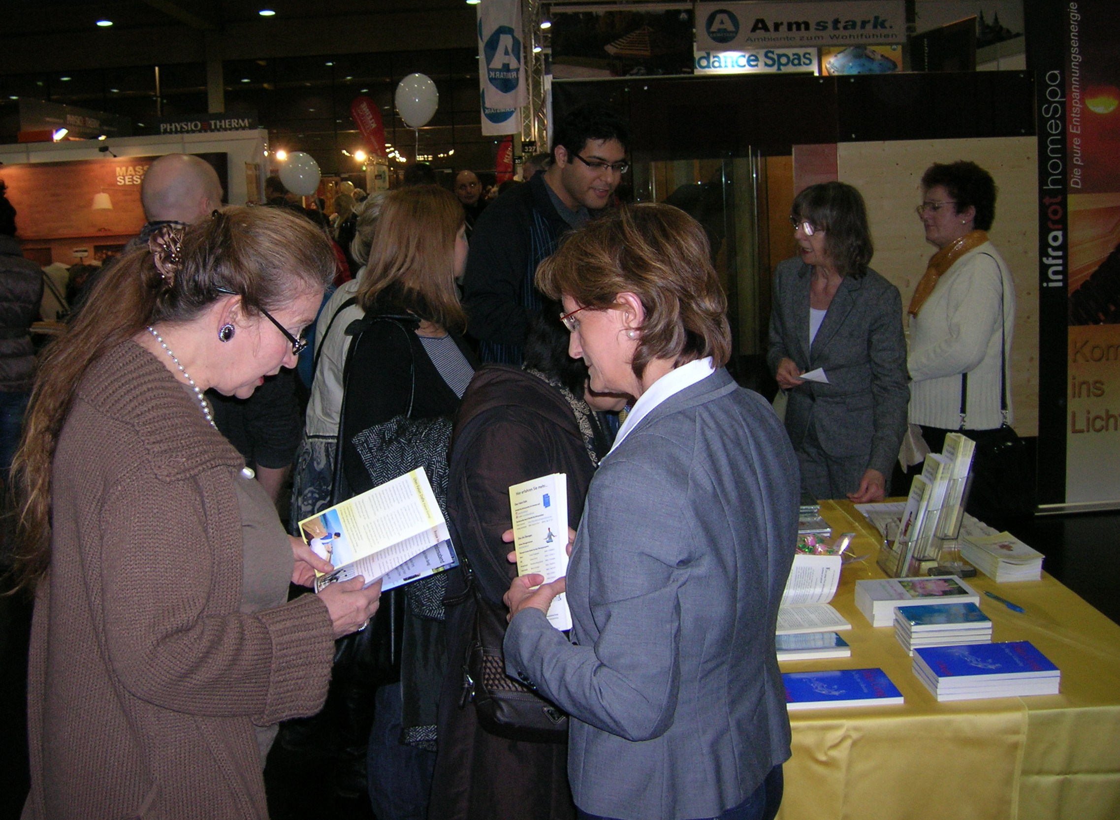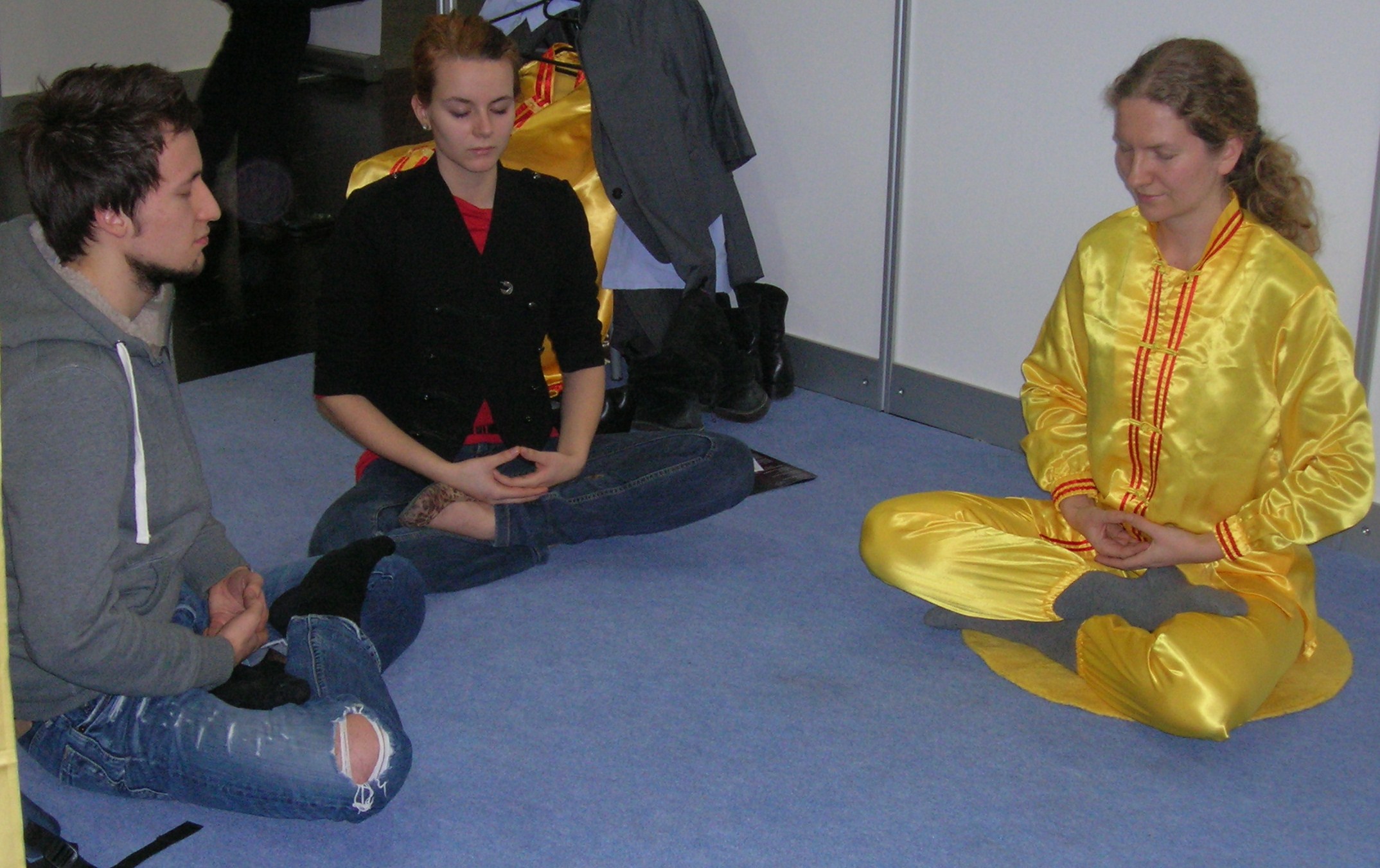在法轮功学员的展位上,有法轮大法书籍和炼功音乐光碟,提供给来访者阅读并购买。法轮功学员穿着黄色炼功服,进行功法演示。祥和的功法和悠扬的音乐,吸引了众多参观者到展位前看个究竟,了解法轮功。