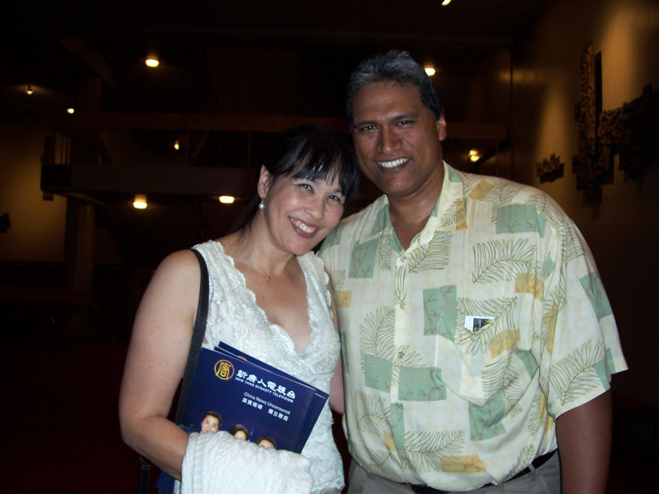 夏威夷航空公司部门资深经理乔治.卡安纳夫妇观看演出后,你一言,我一语,争相赞美神韵。