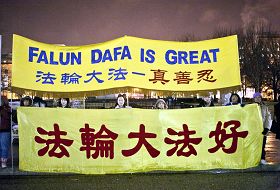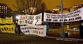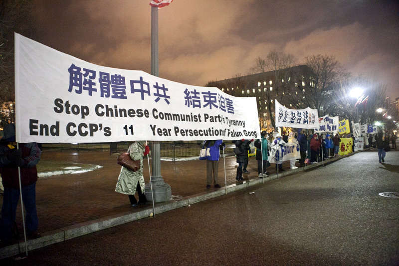 ![]() 二零一一年一月十八日,胡锦涛抵美当天,大华府地区部份法轮功学员在冰冷的冬季雨夜里手持横幅,静静站在与白宫一街之隔的拉法叶公园(Lafayette Park )呼吁停止迫害。 |