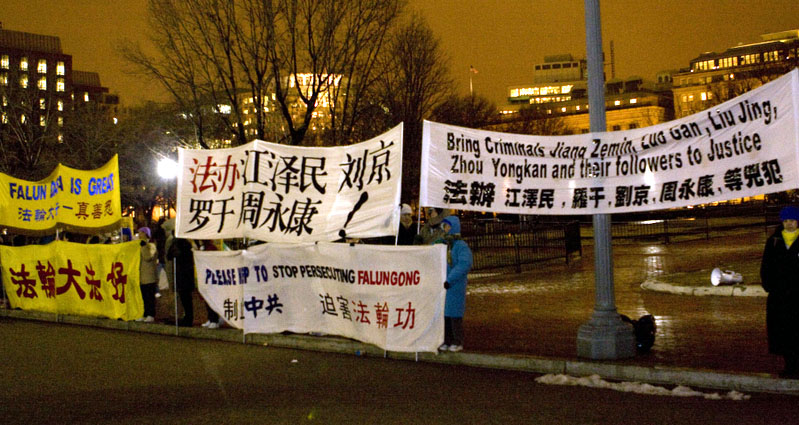 十八日晚,法轮功学员在冰冷的冬季雨夜里手持写有“法办江泽民、罗干、刘京、周永康”、“停止迫害法轮功”、“法轮大法好”、“解体中共,停止迫害”的横幅,静静站在与白宫一街之隔的拉法叶公园(Lafayette Park )。