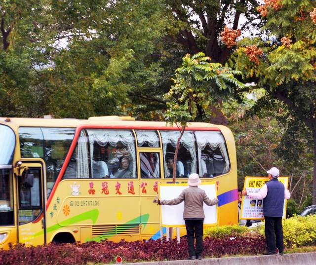 同时,另一些学员手持真相展板,到游览车周围跟大陆游客讲真相,展板的周围立刻围拢游客,有人静静地专注看着展板上的真相,有人提出各种问题。长期在景点讲真相的学员江先生表示,大陆游客各种反应都有,但学员心中只有救人的一念,希望对方明白真相后得救,别无其他想法。常会有游客竖起大拇指表示佩服,也有人看完这面展板,会立刻要求看展板另一面,希望了解更多真相的急迫心情写在脸上。