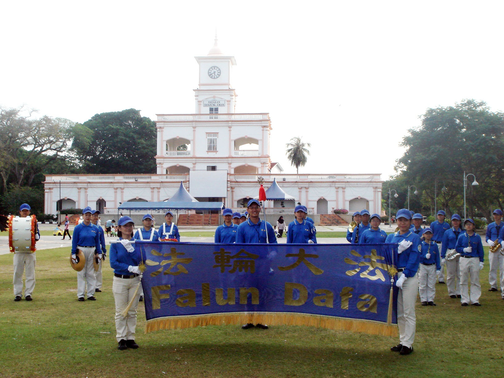 主办商家特意为天国乐团的演出制作了大型的海报,引来了到商场购物的许多公众驻足观看。天国乐团的表演赢得了观众的热烈掌声。在演出结束之后,主持人还用华语和马来语向公众介绍了法轮大法,天国乐团的数位成员当场向公众演示了法轮功的五套功法。