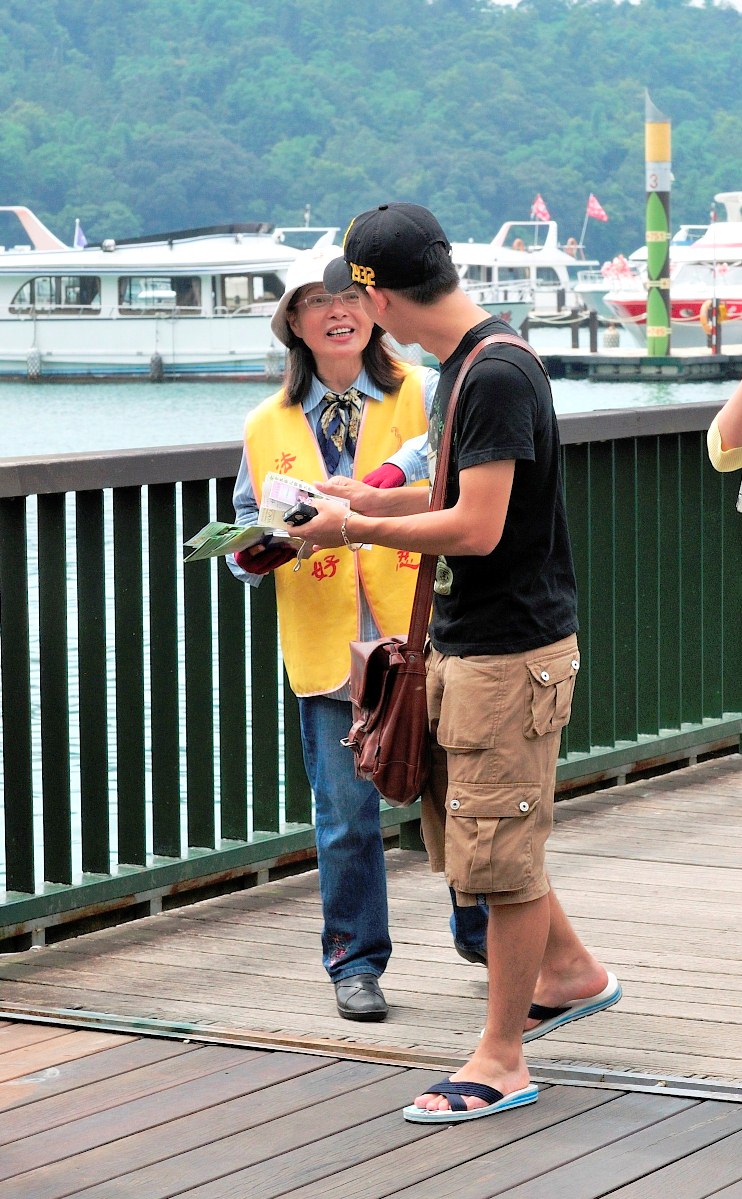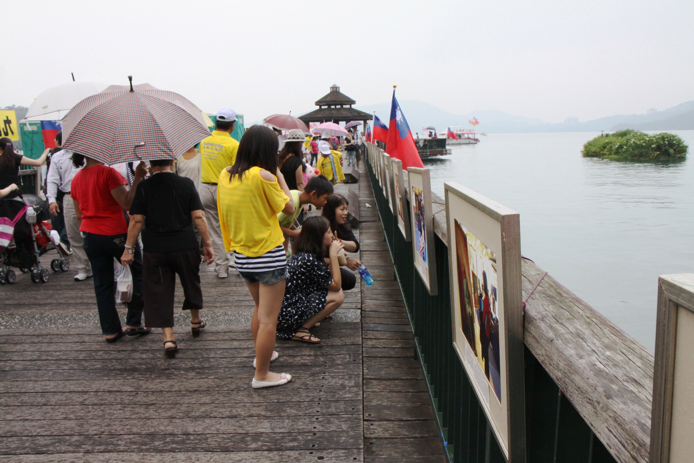 在日月潭同样有很多志工义务帮中国大陆游客解说,并协助他们完成退!党!声明。家住台中的法轮功学员叶女士,坚持在伊达邵码头给中国大陆游客讲真相,将近一年的时间。她常常早上九点多就到,一直到下午四点才离开。她在码头上炼完功后,就开始给游客发资料,告诉他们共产党迫害法轮功的事实,及中国正在发生的三:退.(退出中共党、团、队)热潮。这期间游客来来往往人潮不断,她口渴了,饿了,但她不愿错过每个经过面前的人,所以总是想:“等一下再喝水。”“等一下再吃东西。”就这样,常常一天下来忘了吃,忘了喝。
