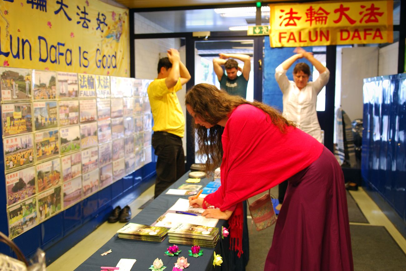 金黄色的“法轮大法”横幅高高的悬挂在摊位的上方,法轮功学员伴着优美的炼功音乐,演示五套功法;桌上摆着大法的书籍及各种洪法讲真相资料,精致美观的纸莲花也非常的吸引人。不少民众在前几年的博览会上已经收到过资料,他们表示还会继续的关注法轮功学员被迫害的情况。有的人了解了真相以后,在反迫害征签表上签名,还找来同伴签名支持。还有不少人被缓慢祥和的功法所吸引,纷纷询问在哪里可以开始学炼。