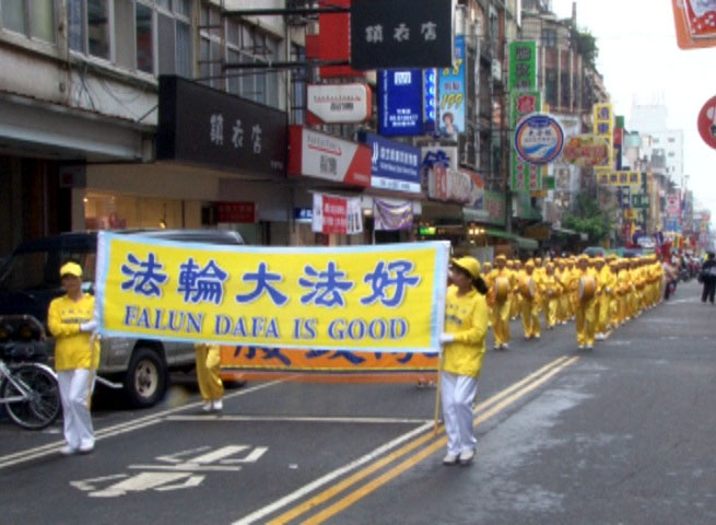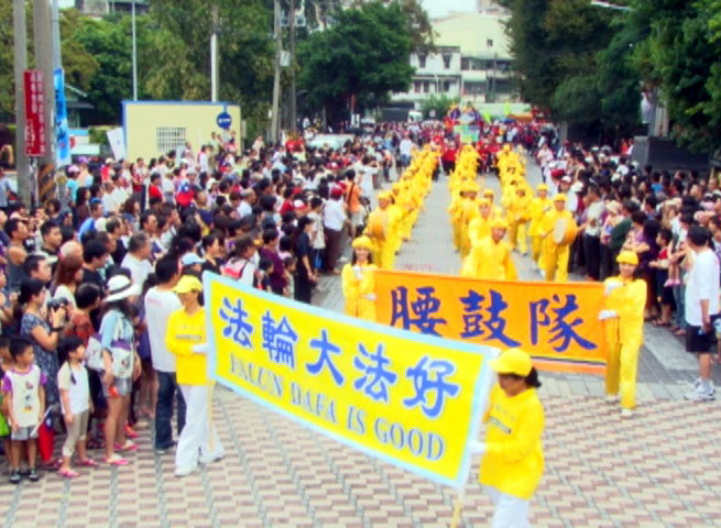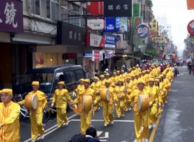 由法轮功学员组成的腰鼓队也应邀参加踩街活动,腰鼓队成员身穿金黄色服饰,脸上始终保持灿烂的笑容、精神抖擞。整齐划一的动作和咚咚的鼓声在绵长的踩街行列中引人注目,掌声不断,许多民众拿出相机拍照、竖起大拇指说:“加油!”、“法轮功最整齐、最棒了!”