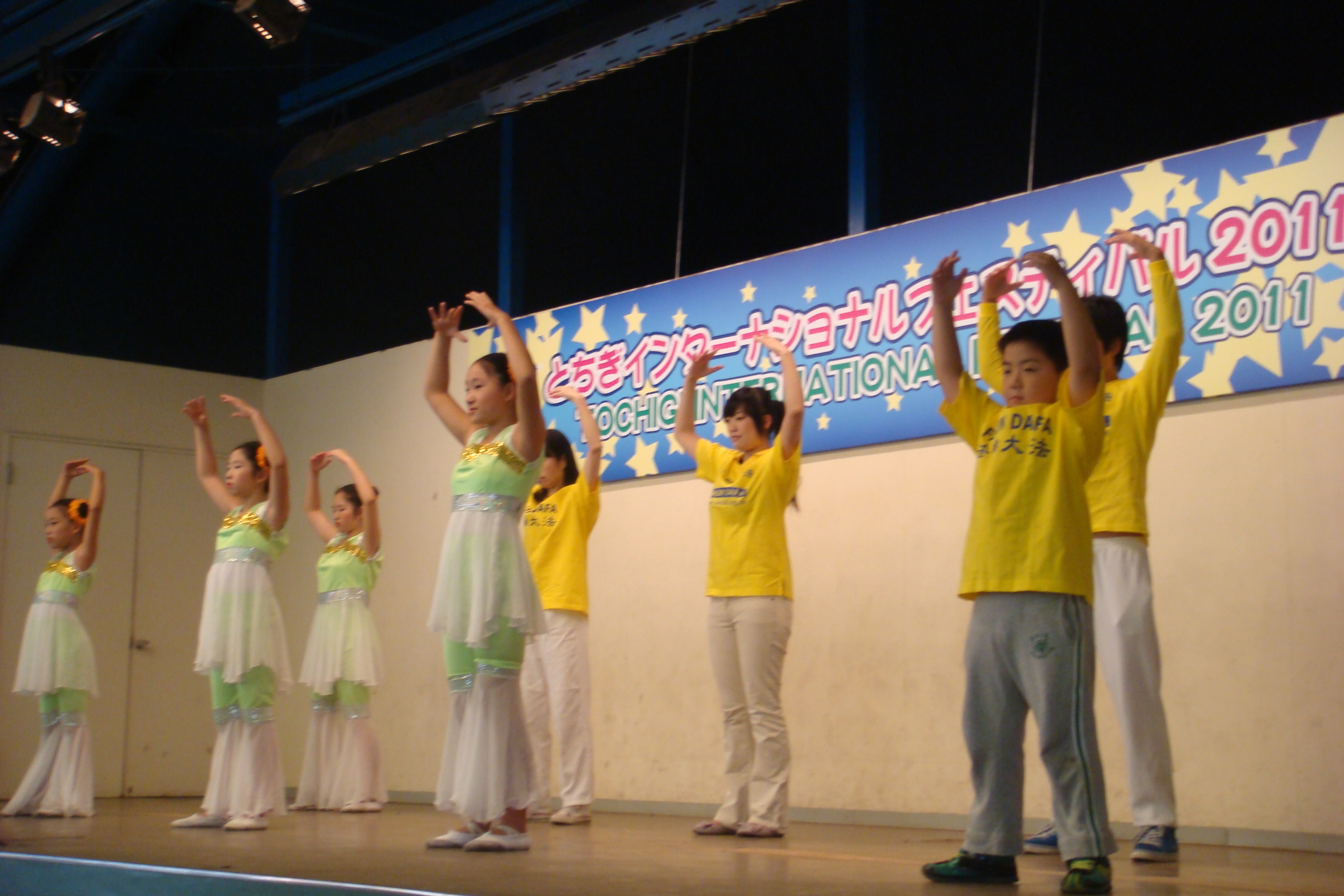 法轮功学员为人们带来了功法演示,还有法轮功小弟子表演中国传统的舞蹈,如扇子舞、舞狮、变脸,吸引了很多观众,赢来阵阵掌声。功法展示时,台下的观众聚集而来,静静地跟着悦耳的炼功音乐和台上法轮大法学员的展示一起做了起来。