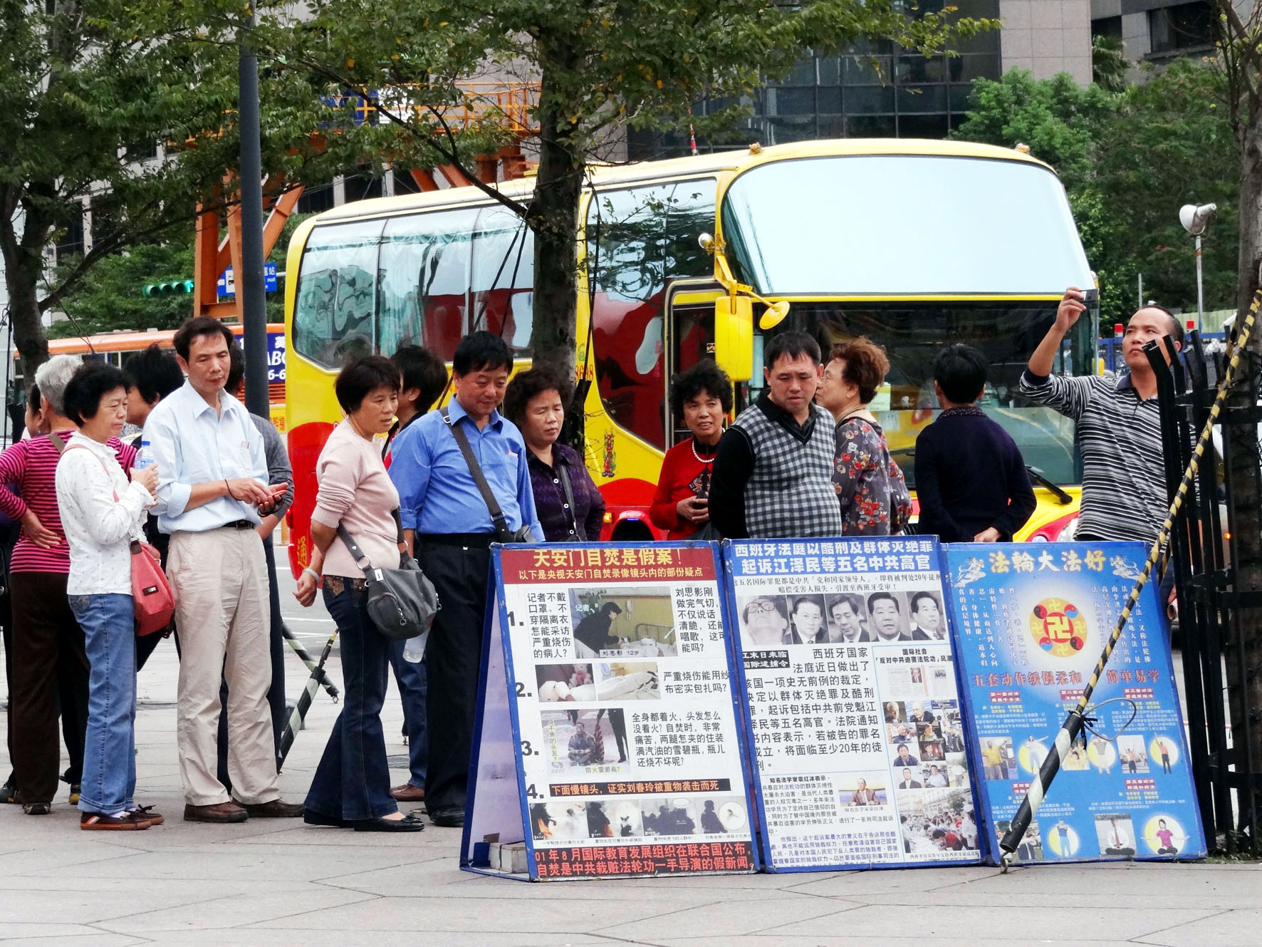 法轮功学员、来自广东的大陆新娘美琪(化名)说,“时常听到导游说,‘有法轮功的地方,在这边等车就对了。’还有好多位导游都会主动介绍,‘这是法轮功,可以多看看多了解了解。’”上个星期琪正在整理材料时,一位导游象是很熟的朋友一样,硬拉着美琪往他的团里走,“赶快走!赶快去帮他们三:退.。”