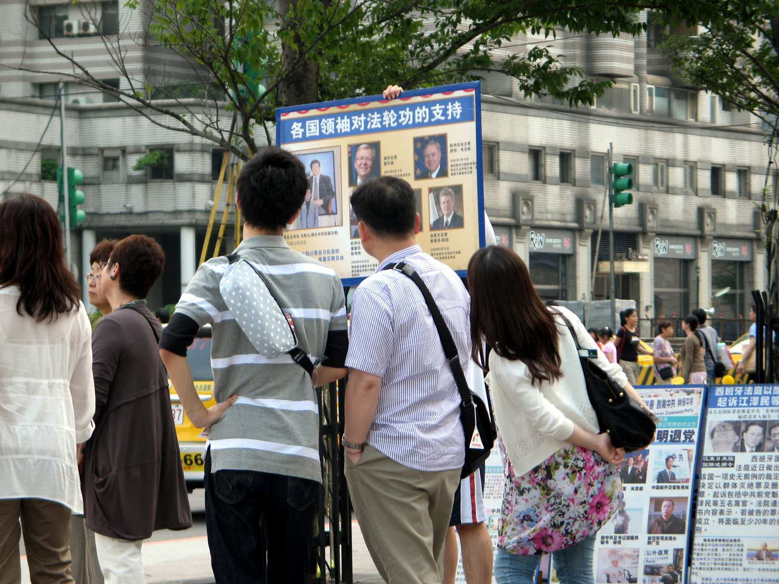 ![]() 人群总是驻足在法轮功真相展板前。 |