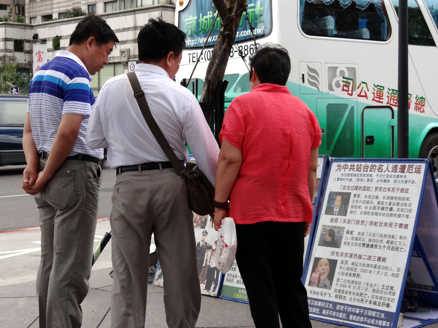 来自沈阳的老先生驻足在展板前,一会儿笑容满面地对着法轮功学员程曦说,“法轮功真好啊,到处都可以看到法轮功。今天是最后一天待在台湾,这几天旅游哪都看到法轮功,这么多人炼啊。”程曦即告诉他,全世界有一百多个国家和地区的上亿的人炼法轮功,只有中国不能炼,共产党统治中国六十多年,害死同胞八千万,半数以上中国人受到过不同程度的迫害,如文化大革命、三反五反,六四到迫害法轮功,中共作恶多端,哪天老天要灭这个组织时,曾经发毒誓要为这个党做贡献的人,都要一起清算的,赶快用化名、小名等退出,当天灭中共时,你就跟它没关系了。