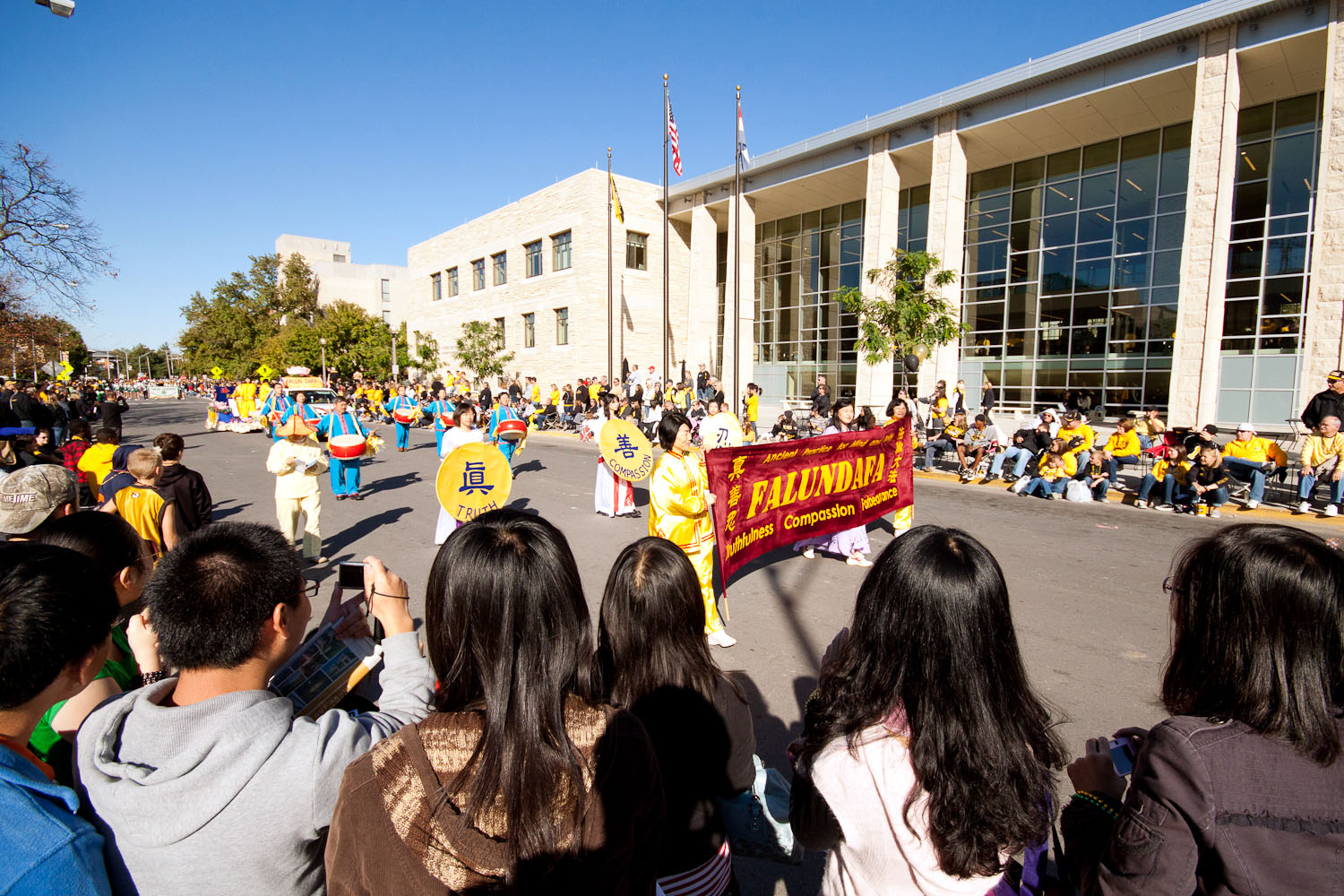 法轮功学员的队伍由仙女队、唐鼓队和花车三部份组成,花车上有学员演示功法。富有节奏的唐鼓声强劲有力,吸引了沿途的许多观众,人们纷纷向法轮功学员欢呼示意。很多华人学生也在观众中,看到法轮功队伍,不少人颇为惊奇,有的不由自主地惊叹:“哇!”有的催促同伴,“快点拍下来!”有的兴奋地挥手。