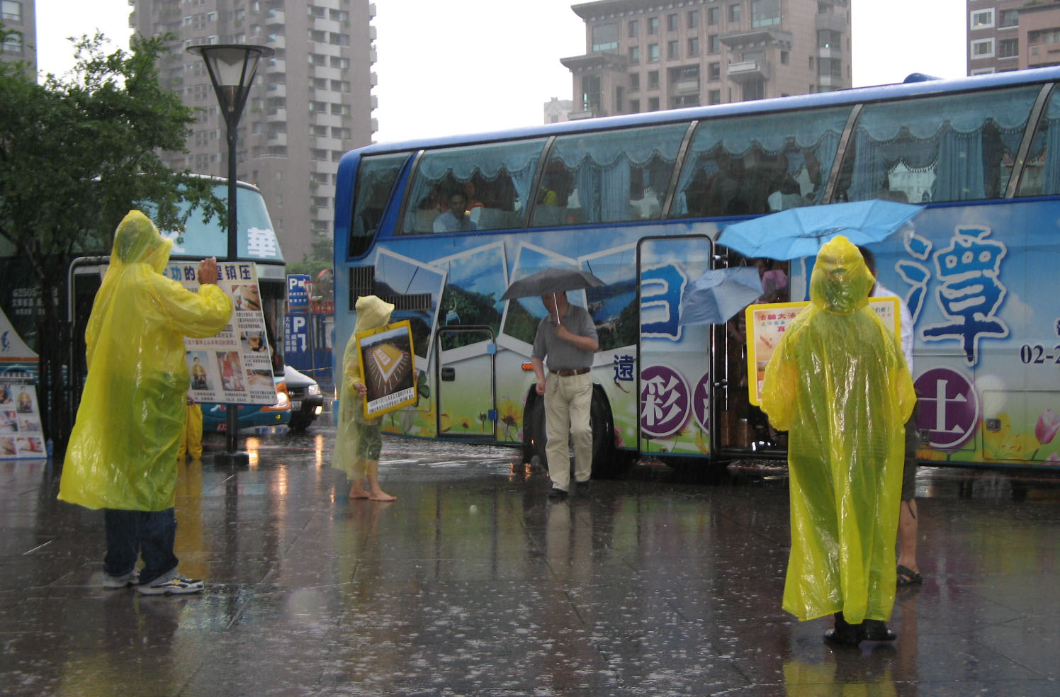 ![]() 六月二十六日下午受到米雷台风外围环流影响,下起了大雨。法轮功学员们一个也没离开,穿起雨衣继续拿展板讲真相。 |