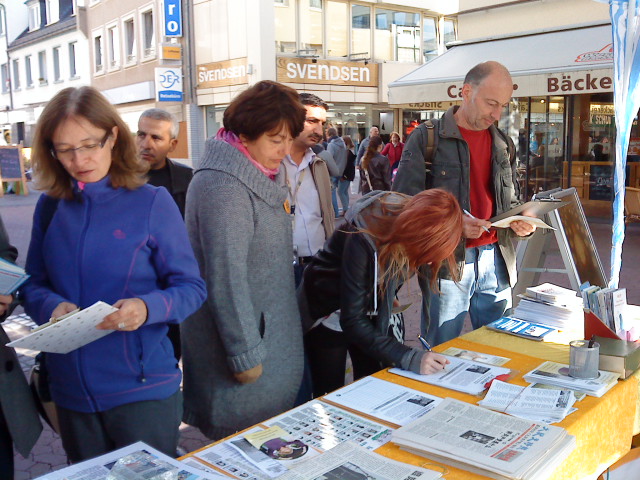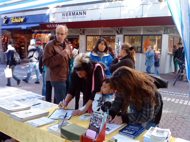 十月十五日这一天,虽然气温较低,但空气清新,阳光明媚,美因茨市中心人头攒动。在购物街的中心地带,法轮功学员们搭建了信息台、布置了真相展板,向美因茨的过往行人介绍法轮大法的美好,以及揭露中共对法轮功学员的残酷迫害。部份学员在祥和、优美的炼功音乐声中,展示了五套功法。很多行人被功法的舒缓、优美所吸引,纷纷驻足观看学员炼功。同时,其余学员在信息台前和购物街的各个路口给行人讲真相,明白真相后的人们纷纷走到信息台前,郑重地在征签簿上签下了自己的名字,表示支持法轮功学员反迫害。