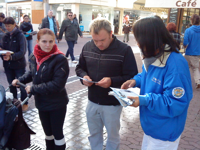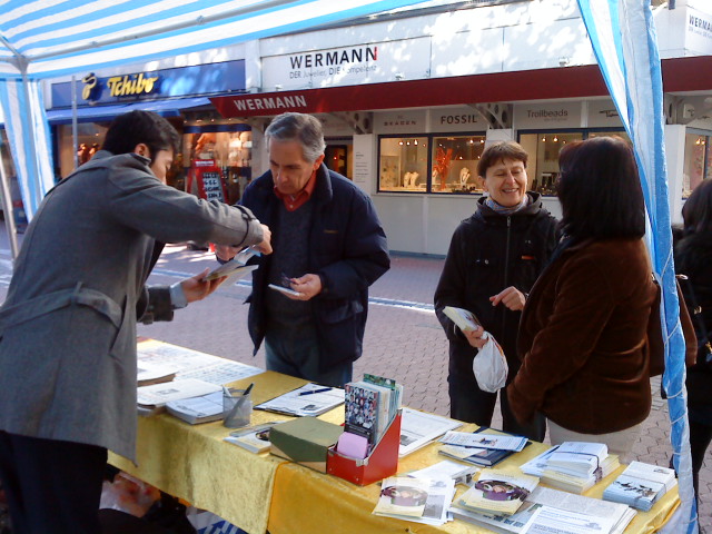 一位生活在美因茨的俄罗斯人告诉学员,他是一位商人,喜欢看书、看过很多关于气功、宗教以及各种学说的书。他对法轮功非常感兴趣,在听完学员的介绍后,他表示一定会上网了解更多关于法轮功的信息。