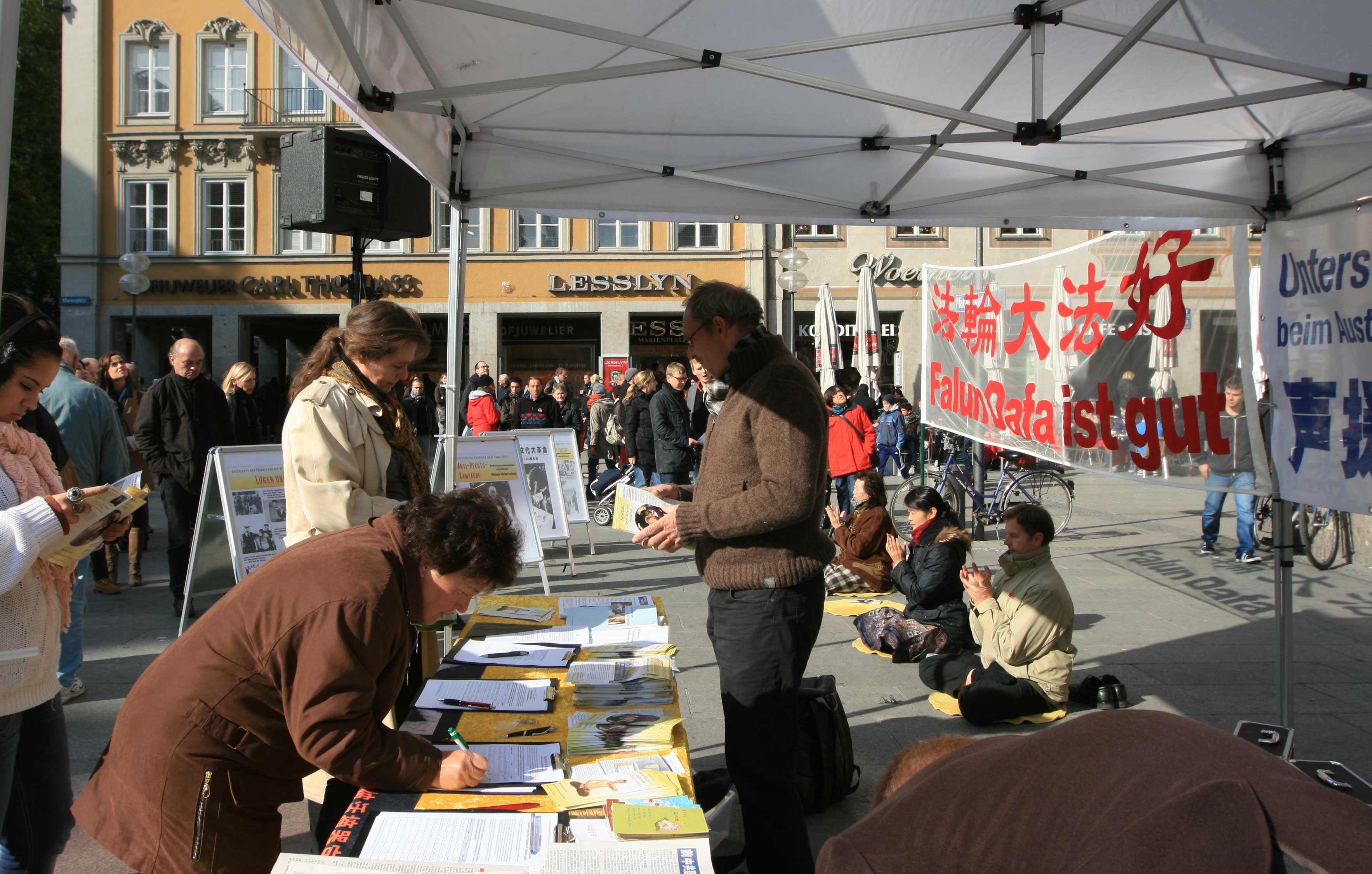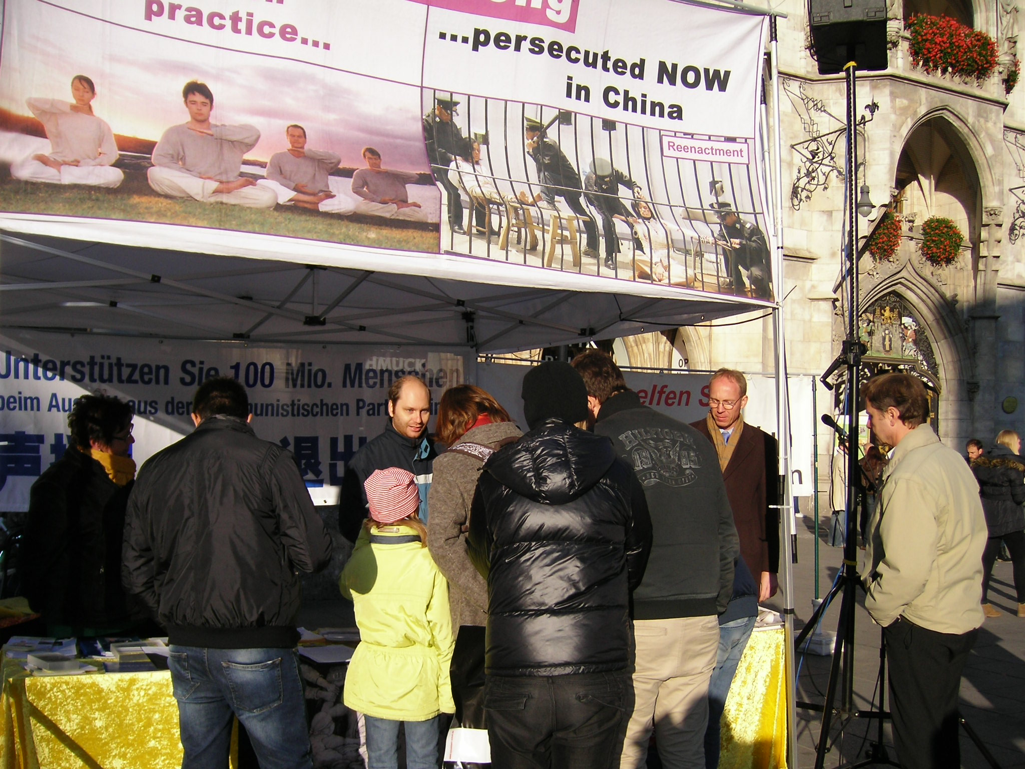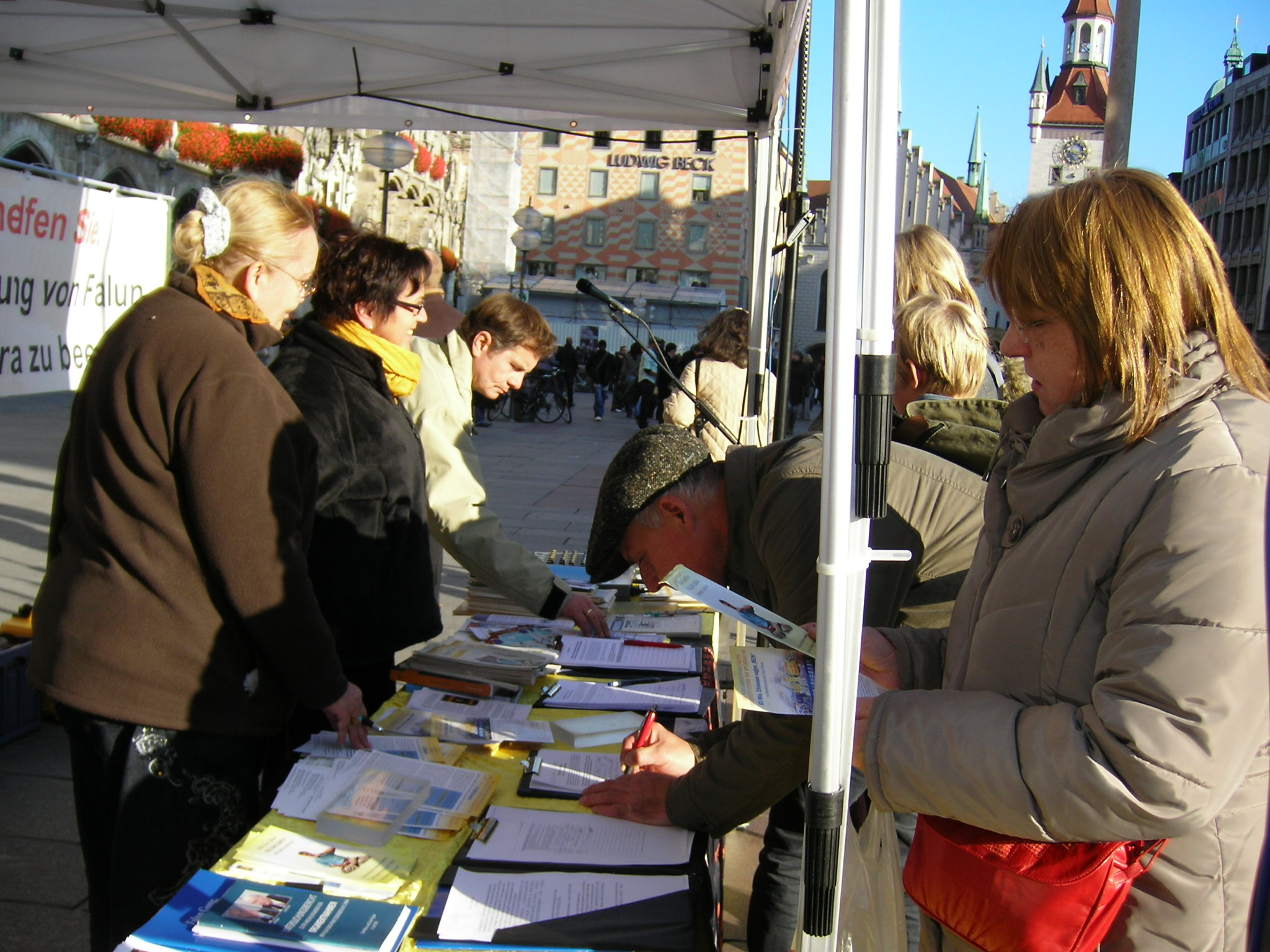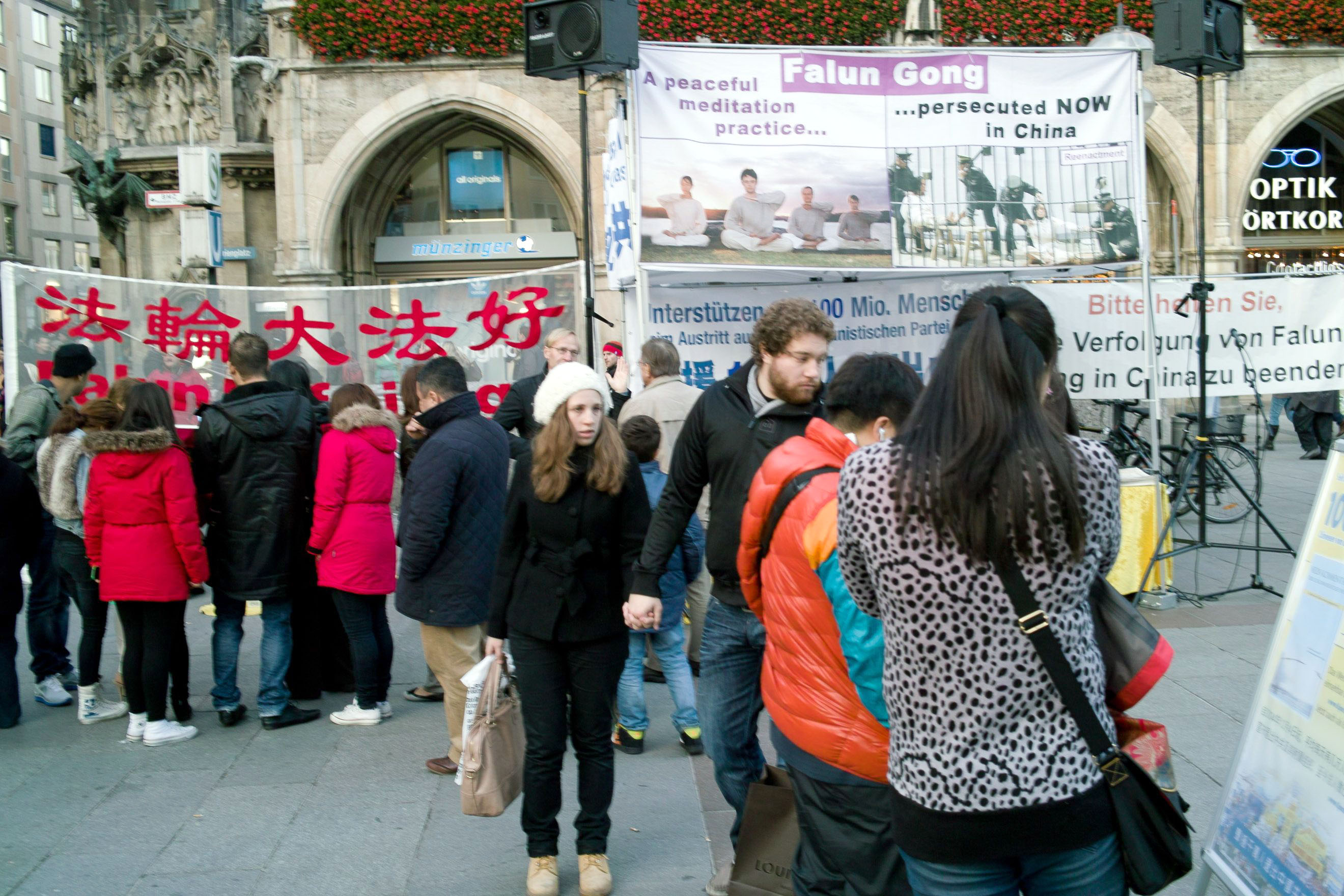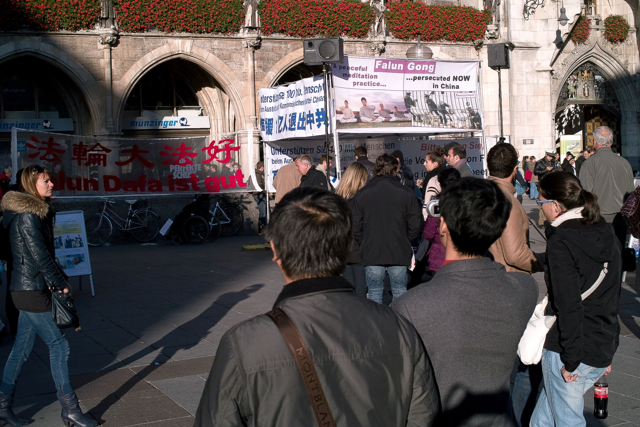 二零一一年十月二十二日,德国慕尼黑的法轮功学员在市中心玛琳广场(Marienplatz)上举办声援一亿四百万中国民众退出中共的活动,揭露中共邪*党-的罪行,告诉人们法轮功真相,规劝中国人退出邪*党-及其组织。