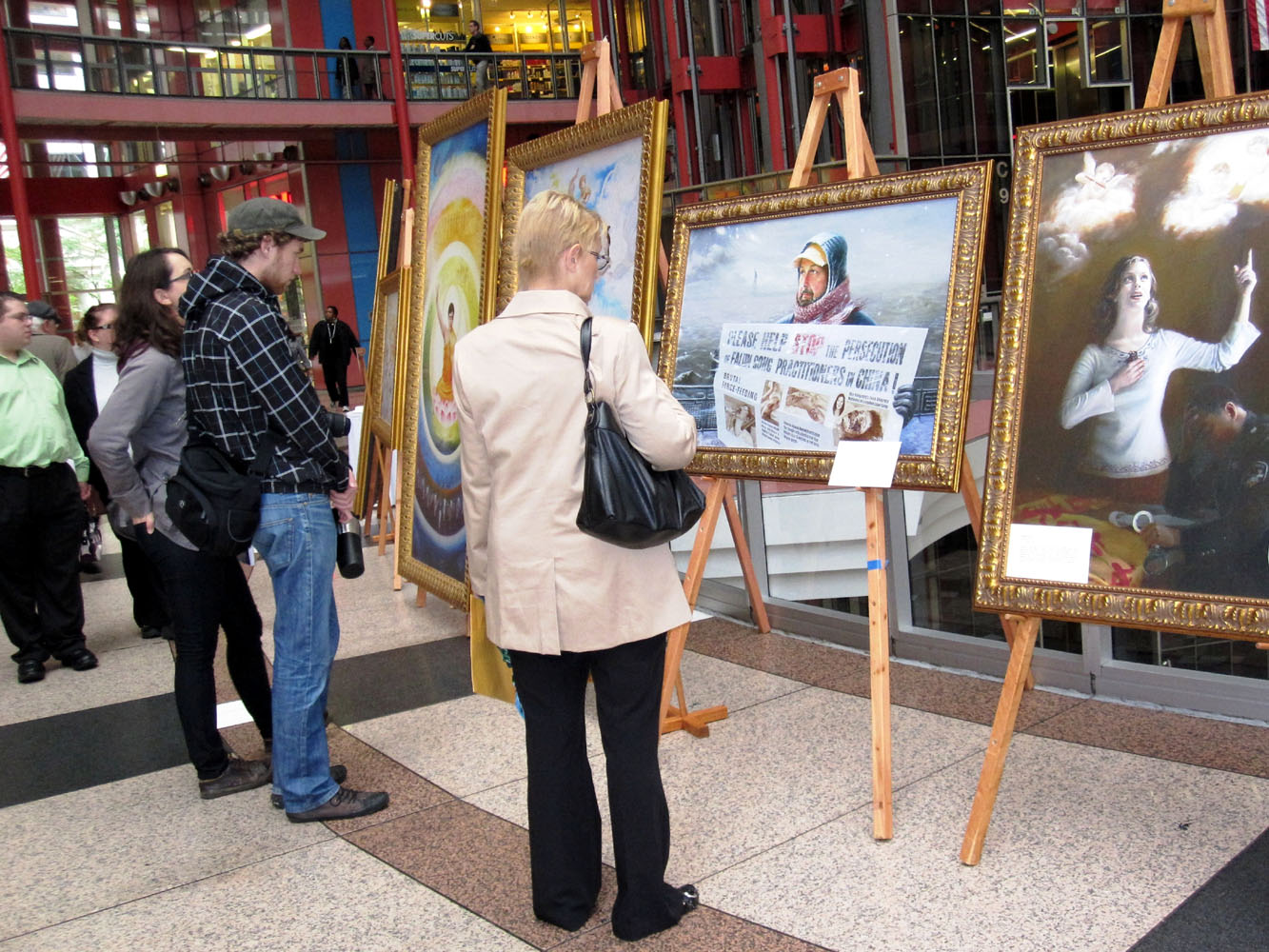 作品都栩栩如生。观众们看完画作后主动和学员交谈,询问什么是法轮功,法轮功为什么会遭到迫害。他们有的是第一次听说迫害的消息,对于这样平和的修炼群体却遭到如此残酷的迫害,甚至被活摘器官感到十分震惊,并在制止迫害法轮功的请愿书上签名;也有的人表示要学炼法轮功,还问在哪里可以学习;也有的人赞叹画作如此逼真,他们感谢学员把如此好的作品带来芝加哥,并把真相讲给他们听。