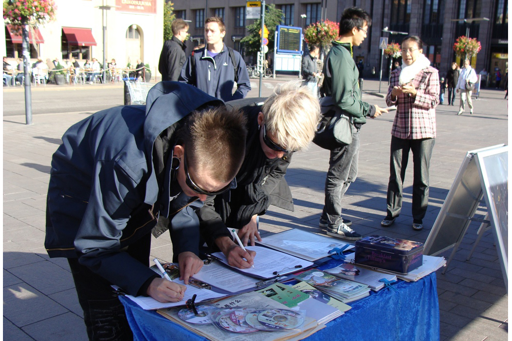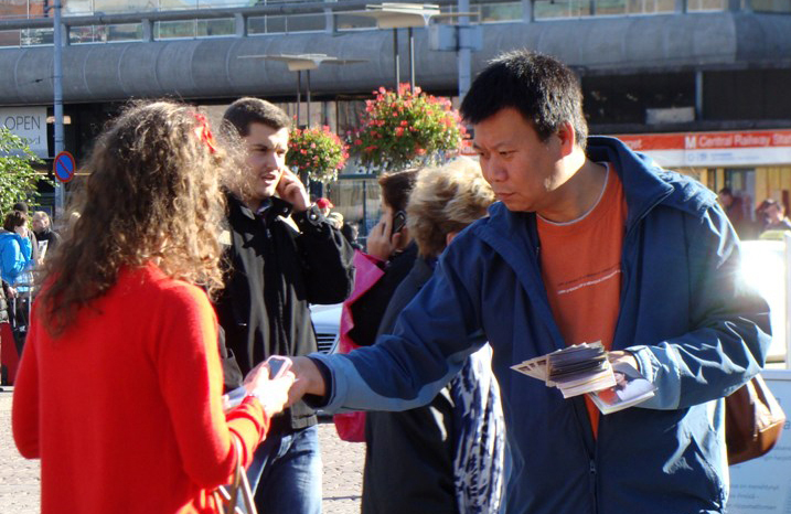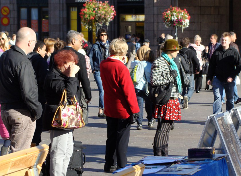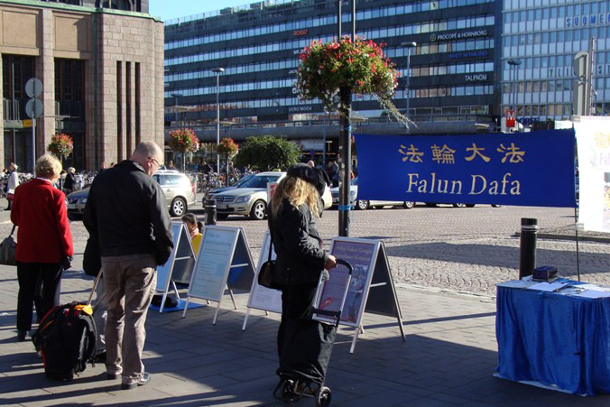 ![]() 芬兰法轮功学员在首都赫尔辛基市中心火车站设立真相点,吸引过往人们驻足了解真相。 |