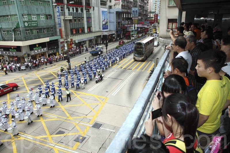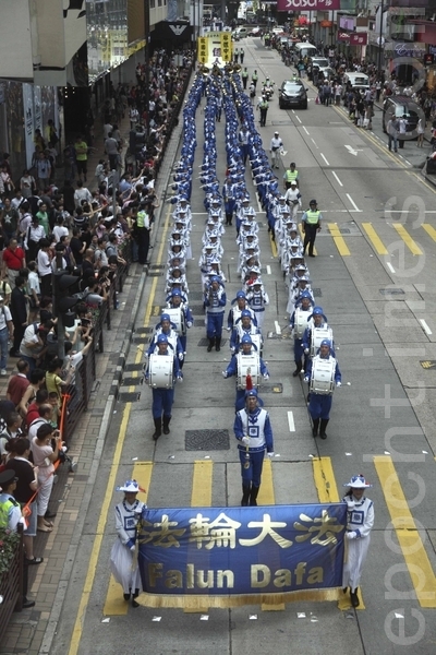 ![]() 二零一一年国殇日,八百多名法轮功学员的游行队伍在天国乐团的领头下,由长沙湾游乐场出发,途经九龙多个繁华街道,大批人潮在马路两旁观看拍照。 |