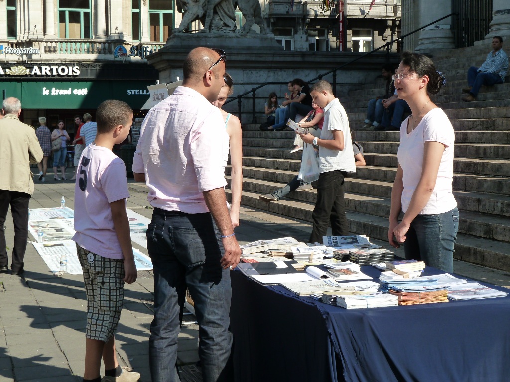 当天,阳光明媚,温度适中,大街上人来人往。布鲁塞尔市中心的交易宫前的开阔地带,是旅客大巴上下车停靠的地方,所以人特别的多。法轮功学员在展桌上摆放了法文、荷兰文、英文、中文等不同文种的资料供人们取阅。其中中文的资料种类最多,有便于大陆同胞携带的《·九·评*共产党》小书、小册子、报纸、法轮功真相光盘等。