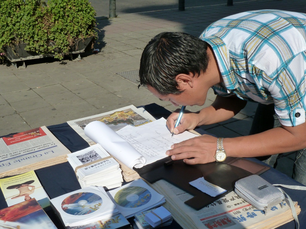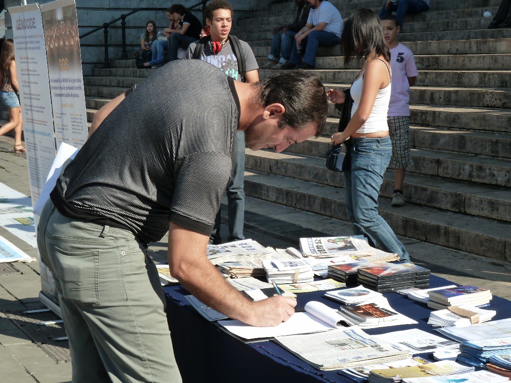 阿勃德是一位武术爱好者,他看到迫害图片很是震惊,他请法轮功学员介绍那些图片上发生的事情。当他了解是发生在中国的法轮功学员被迫害后,他说他知道在中国是没有自由的。针对中共酷刑折磨法轮功学员的图片,他一再重复说,这是犯罪。他在签名簿上留言:迫害是犯罪,必须停止迫害。