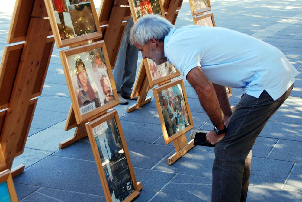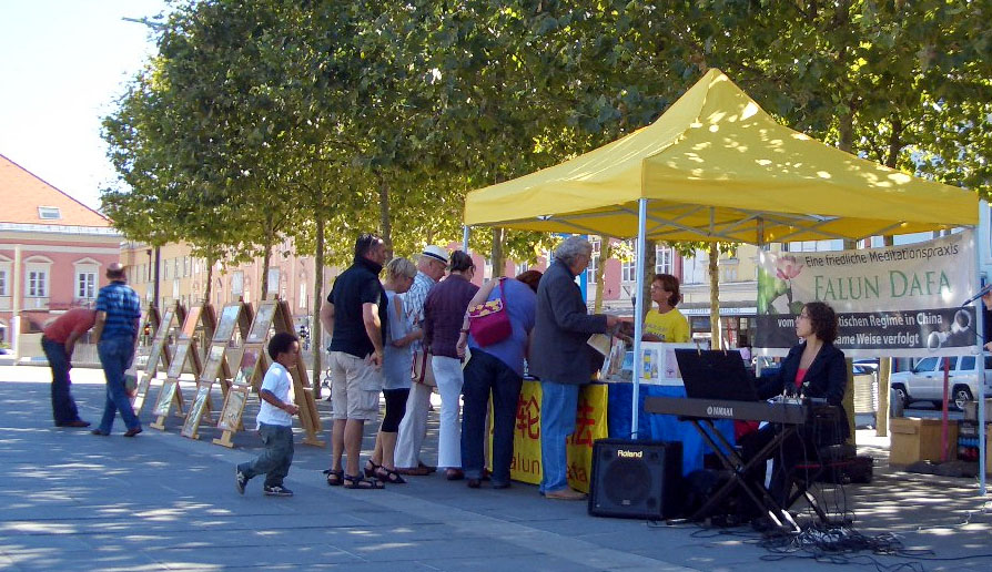 活动在位于市中心老城的新广场(Neuer Platz)举行。真相图片展前有很多路人驻足观看。学员们身着黄色炼功服演示功法,祥和的场面吸引众人前来看个究竟。法轮功西人学员组织的乐队演唱了“法轮大法好”和揭露迫害的歌曲。一位女士在演唱结束后对法轮功学员说,她从来没听过这么美的歌曲,太美了,她要把女儿叫过来,也来听一听。