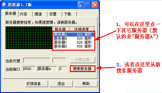 这个方法有时要多试几次,有时要试较长时间才能成功。如果四个服务器都打不开网页,则可以稍等一段时间,然后点“搜索服务器”按钮,从新搜索服务器,再按上面的方法操作。如果搜索不到服务期,可以关闭逍遥游软件,过一段时间再打开试试。以上方法同样适用于自由门。