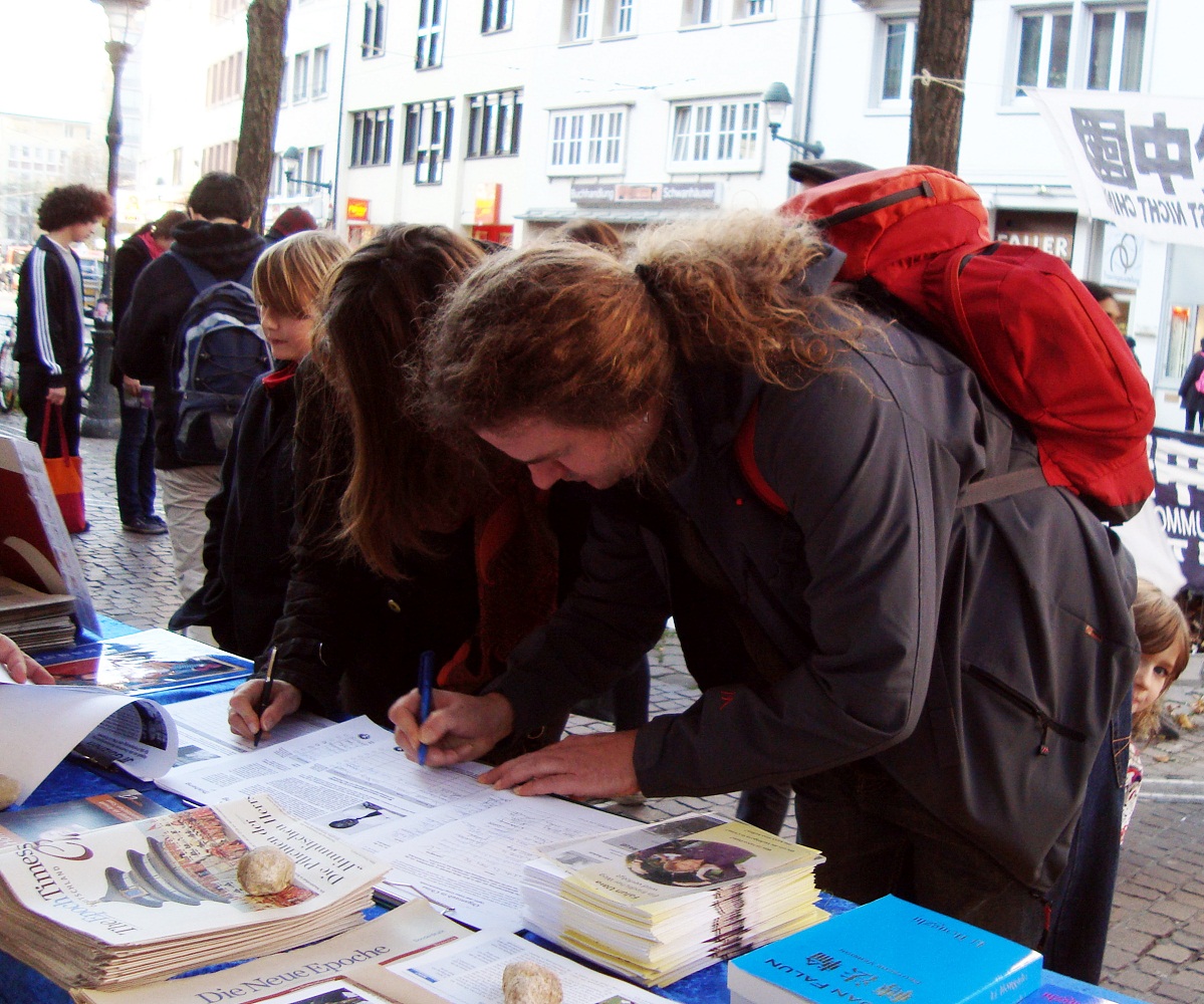 ![]() 一对德国夫妇在征签簿上签字声援法轮功 |