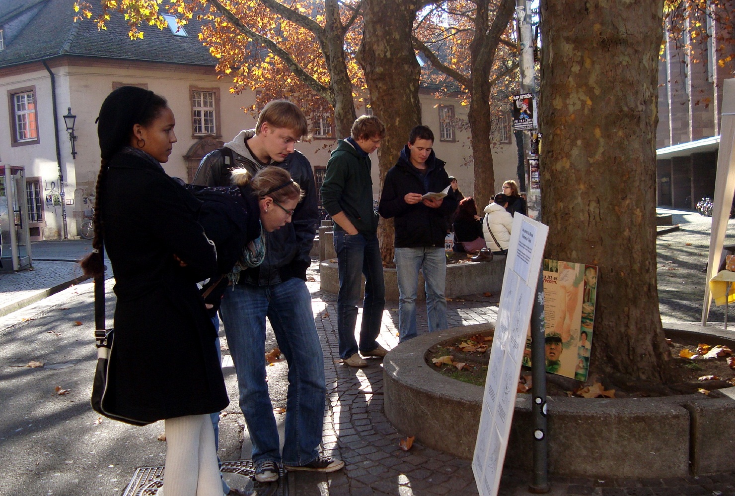 ![]() 信息台旁,弗莱堡大学的学生在看法轮功真相展板和资料 |